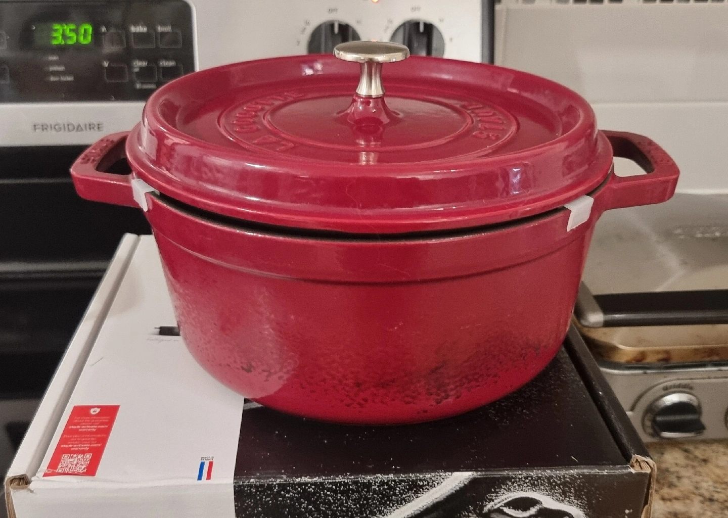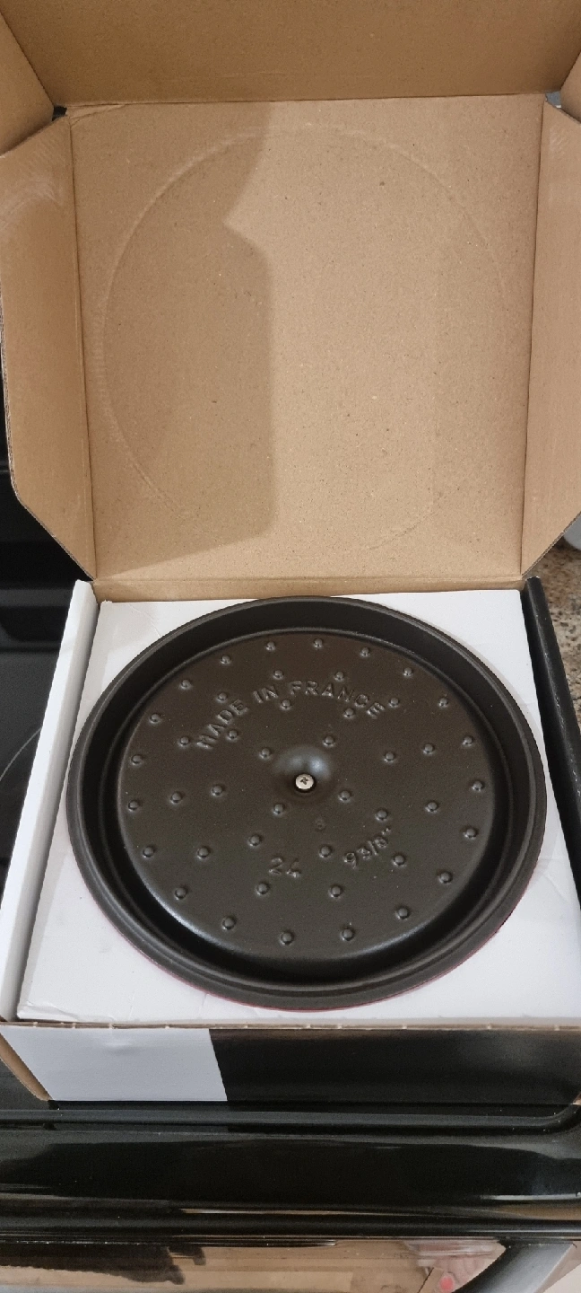 322Selling a Staub Cocotte Ronde Dutch Oven in a cherry red colour! This is a high-quality, enameled cast iron pot renowned for its superior heat retention and distribution, made in France. Ideal for slow-cooked meats and vegetables, hearty stews, searing, roasting, caramelizing food and even baking bread. The last photo shows two small scratches of the pot. Includes the original box.