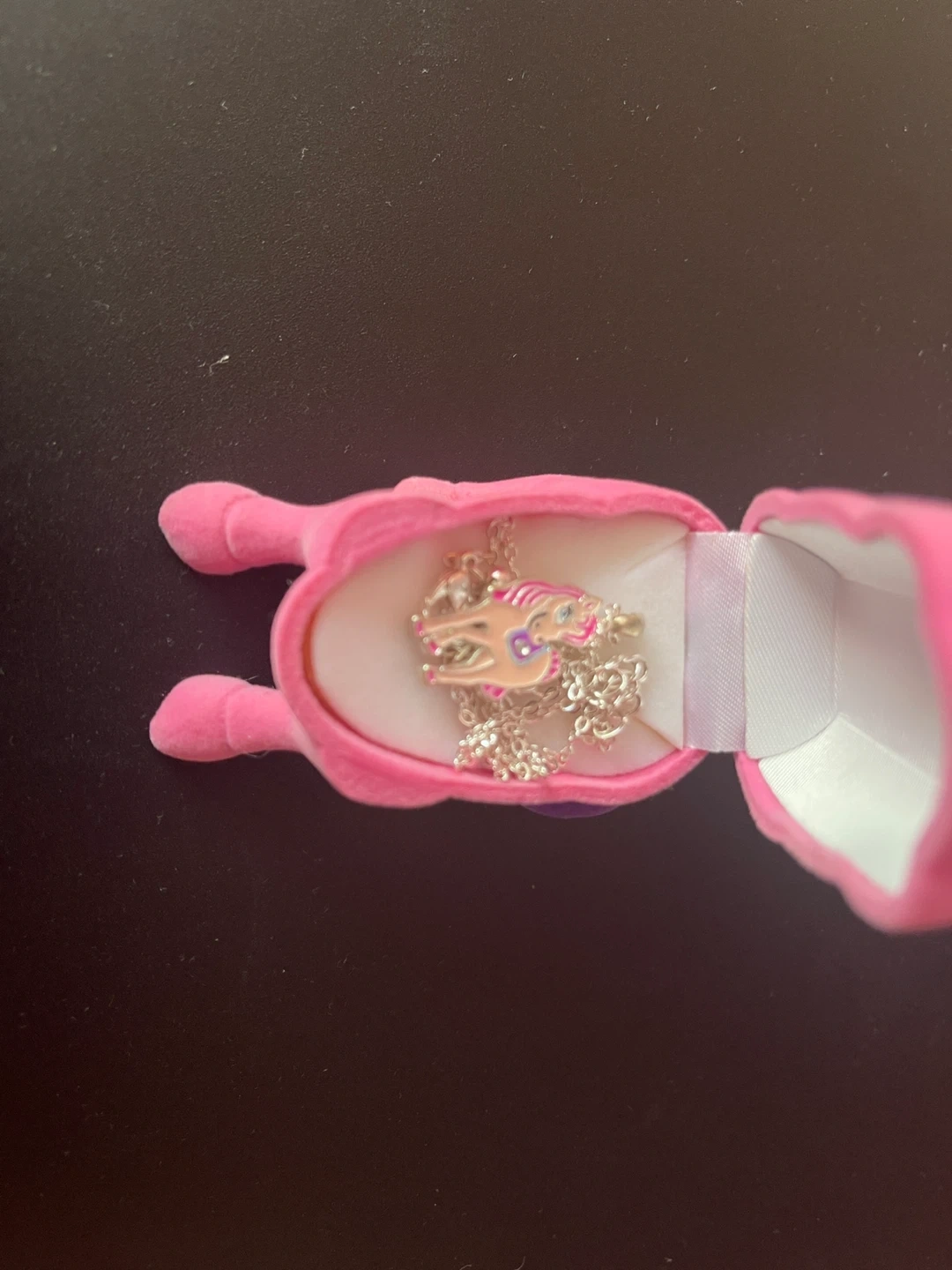 Cute unicorn pendant necklace! Never worn before. It comes with an adorable pink unicorn-shaped box, perfect for gifting or storing the necklace. The necklace features a silver chain and a colourful unicorn pendant. The box is pink with a purple mane!