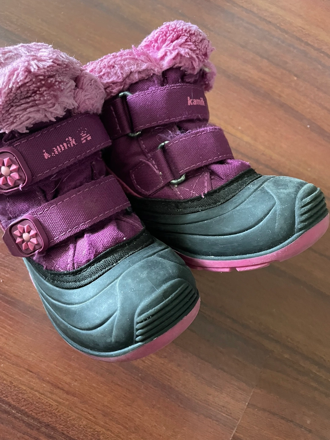Keep your little one warm this winter with these cute Kamik winter boots! They are in great condition and ready for some snowy adventures. The boots are purple and pink, with a black rubber bottom and velcro straps for easy on and off. Size 7.