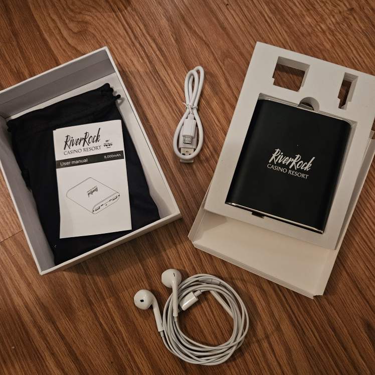 power bank from River Rock Casino Resort! It comes with its original box and, including a user manual, charging cable, carrying pouch . The power bank has a capacity of 8,000mAh.