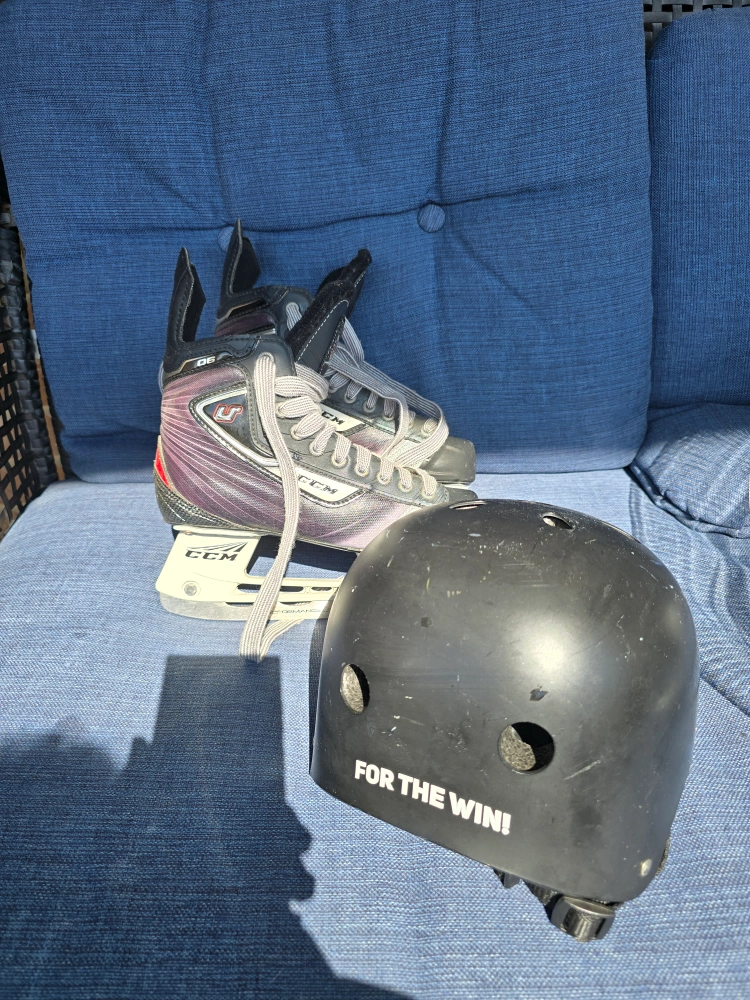 Selling a pair of CCM ice skates, size 4. They come with a helmet that says 'FOR THE WIN!' Great for beginners or anyone looking to upgrade their gear Steeles and yonge pick up