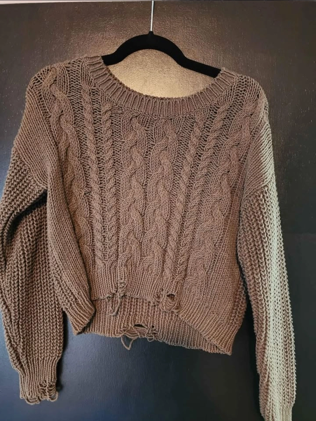 Cozy up in this stylish Garage cropped knit sweater! It's a lovely green colour, pictures do not show the colour well but is a darker green, and features a unique cable knit distressed design. The sweater is a size L/G and would be a great addition to your fall or winter wardrobe. Brand new without tags.