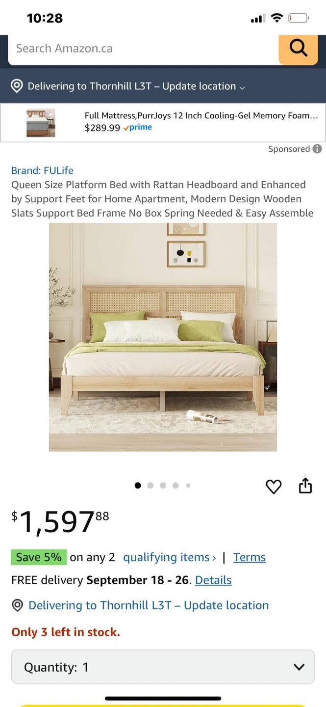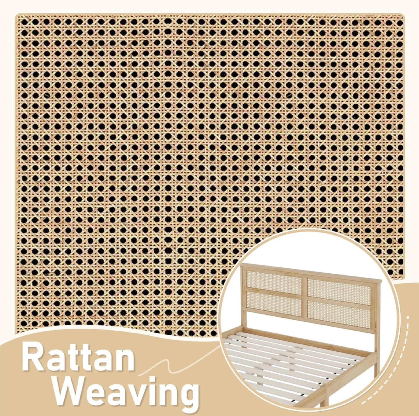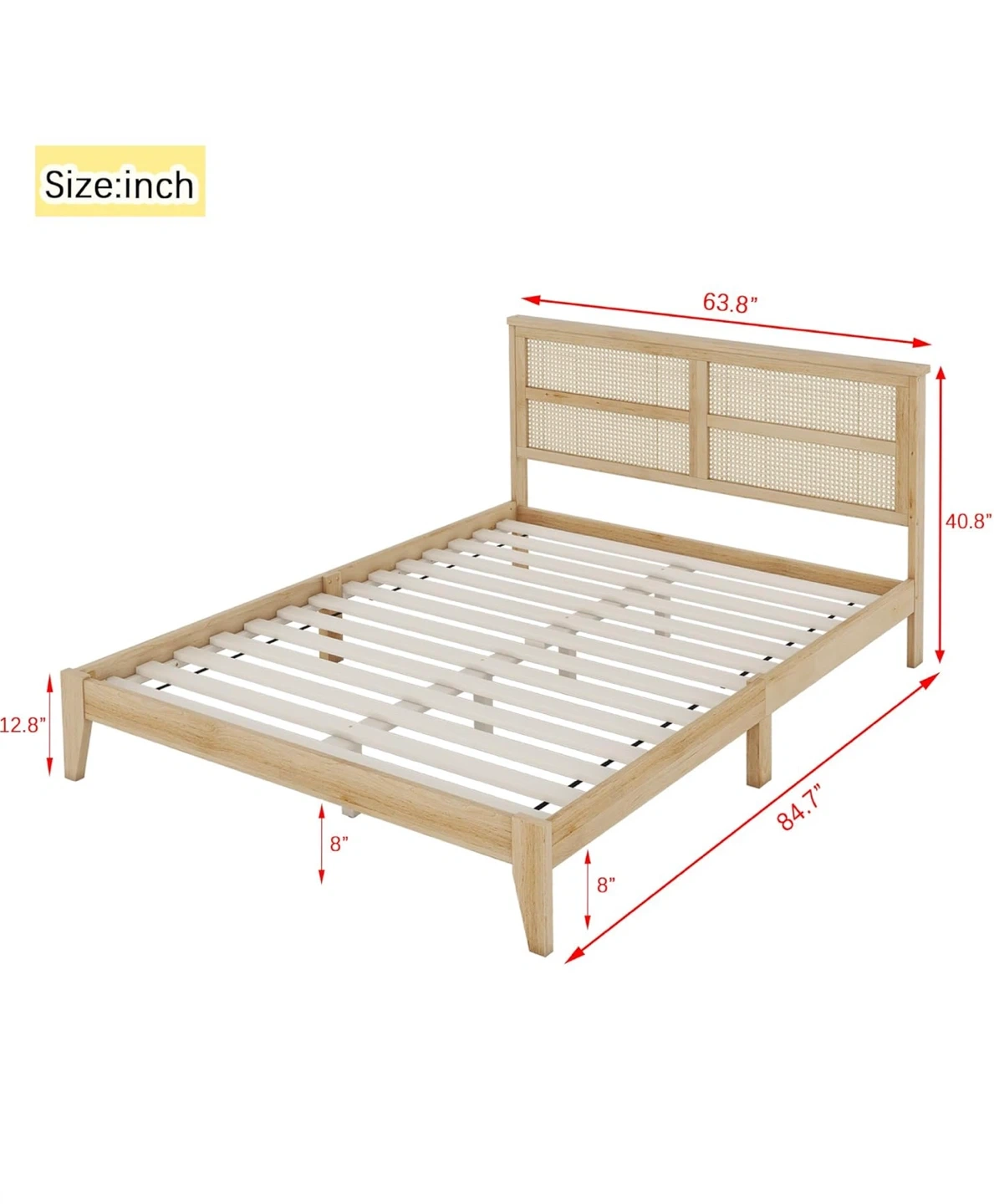 Selling a queen size platform bed by FULife! It features a rattan headboard and support feet, perfect for a modern apartment or home. The bed has wooden slats, so no box spring is needed, and it's easy to assemble. Dimensions: - Width: 63.8 inches - Length: 84.7 inches - Headboard Height: 40.8 inches - Frame Height: 12.8 inches
