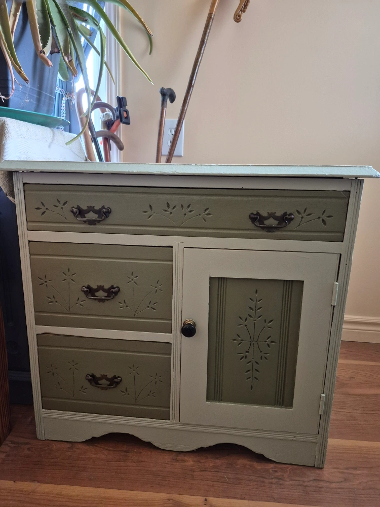 Cute sage green sideboard cabinet with decorative floral cutouts! It has three drawers and a cabinet for storage. The hardware is antique bronze. It's a unique piece to add some charm to your home