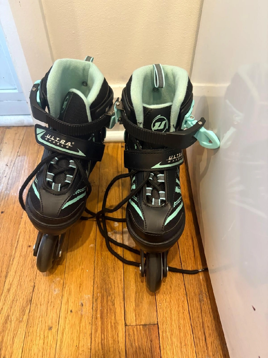 Get ready to roll with these Ultra Wheels inline skates! They're in good condition and ready for some fun. The skates are black with light blue accents. Adjustable for growing feet. Perfect for beginners or experienced skaters!