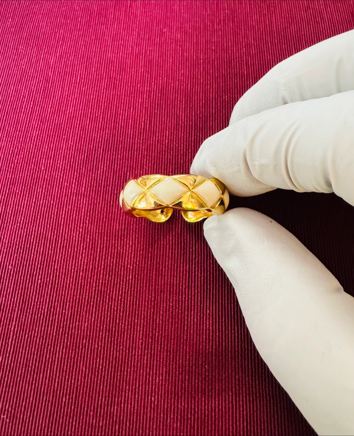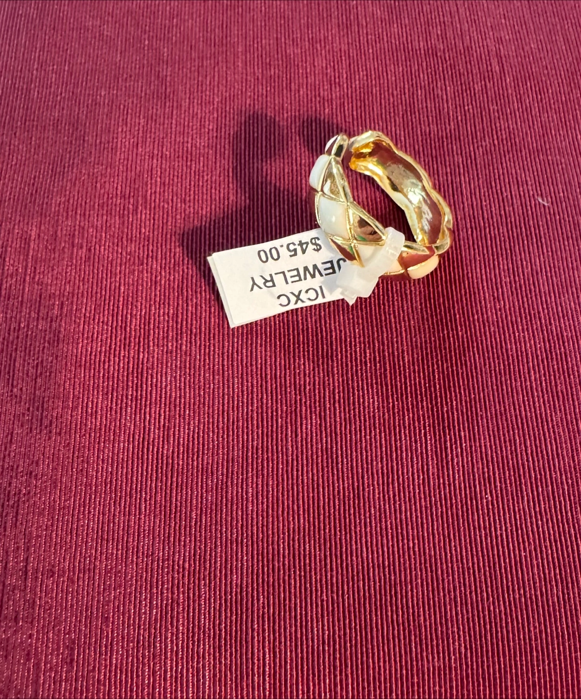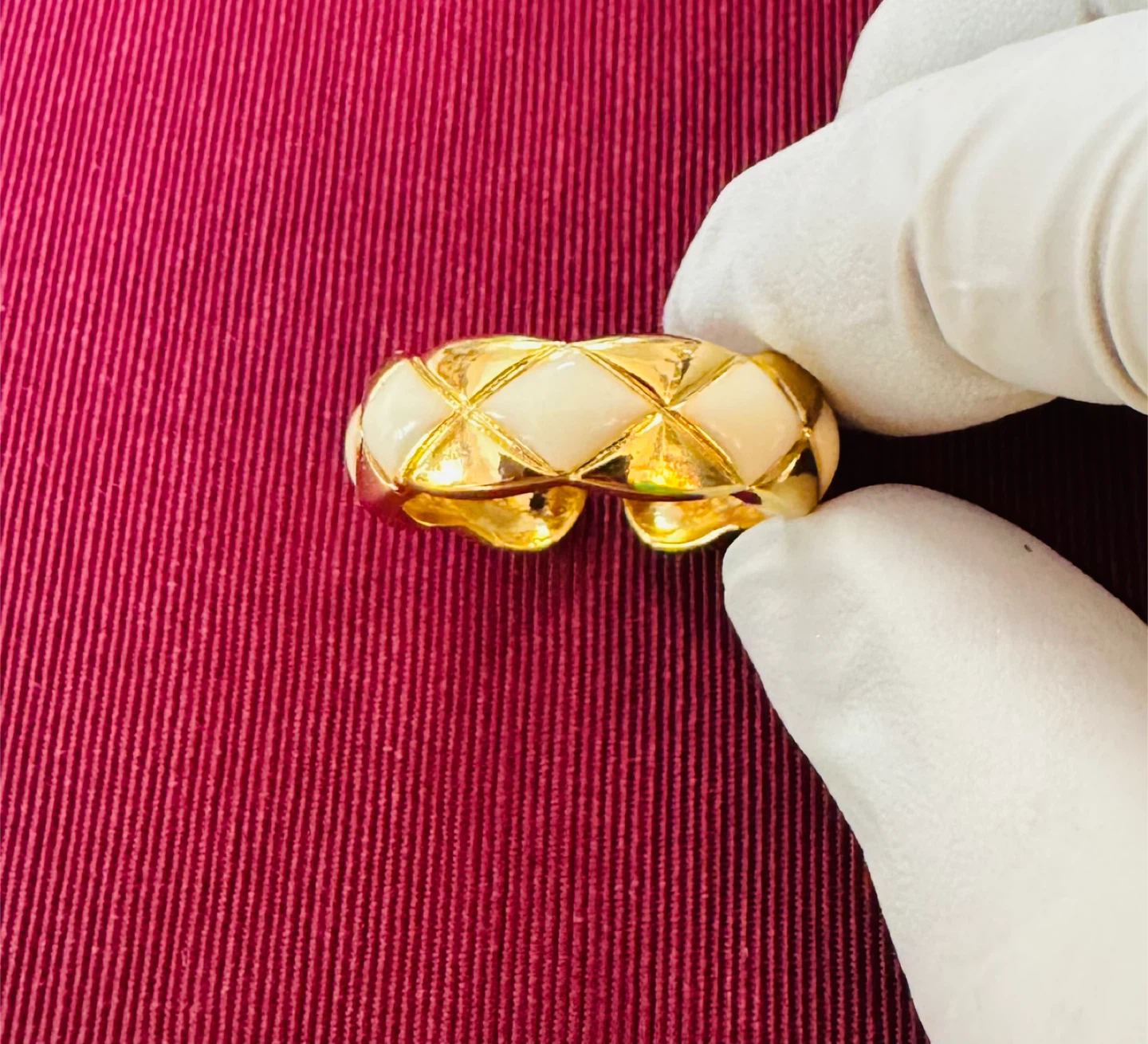 The Cushion Cut Quilted Channel inspired design is 14K Gold Dipped with handmade Enameled in IVORY. Adjustable Ring