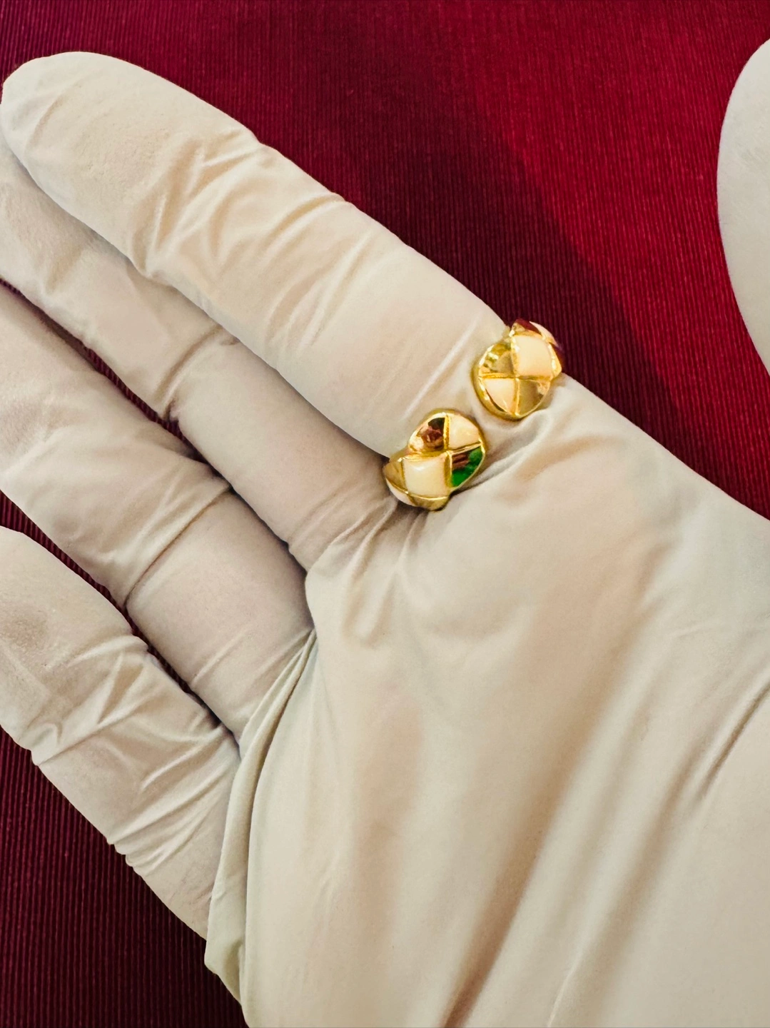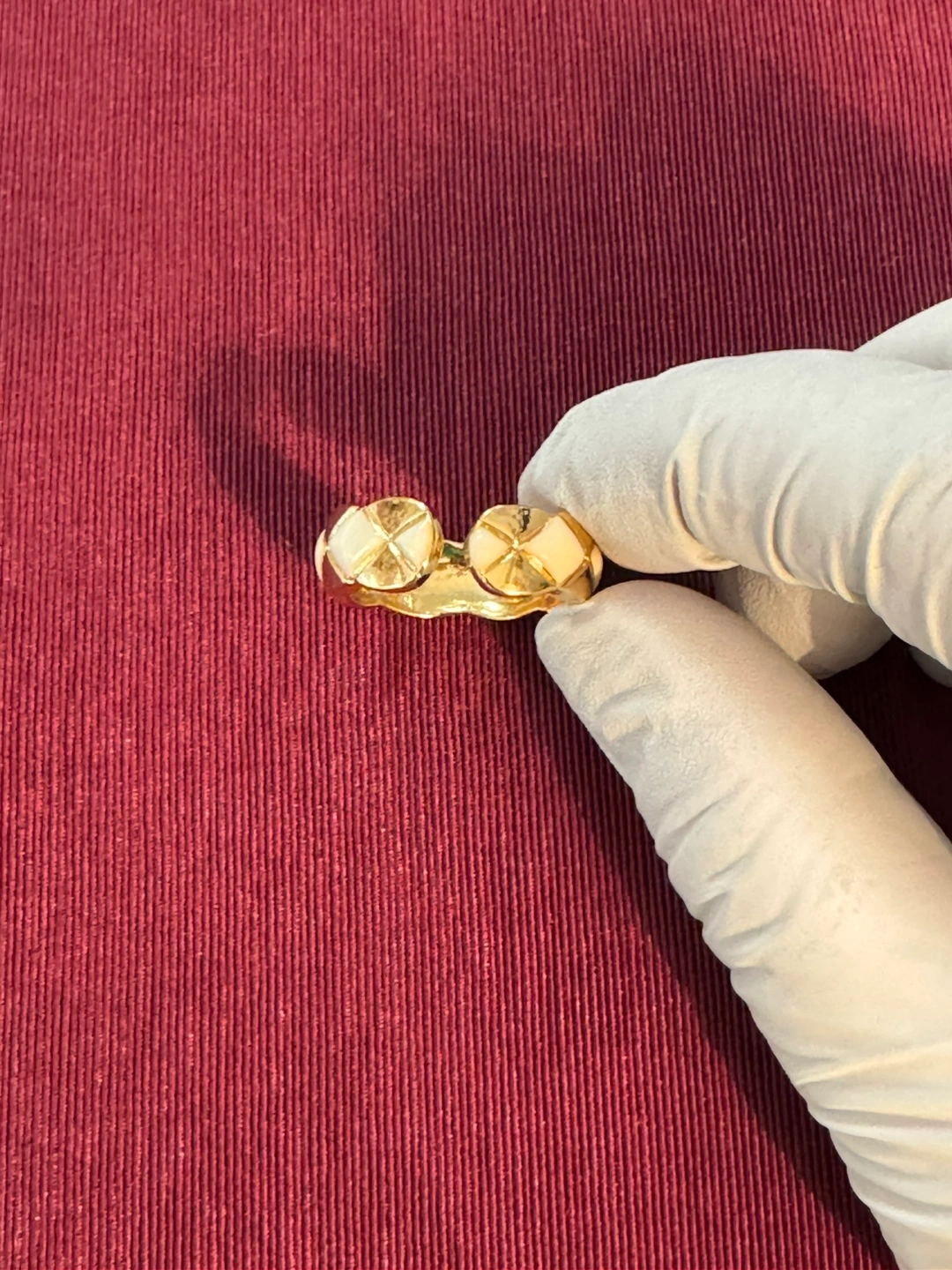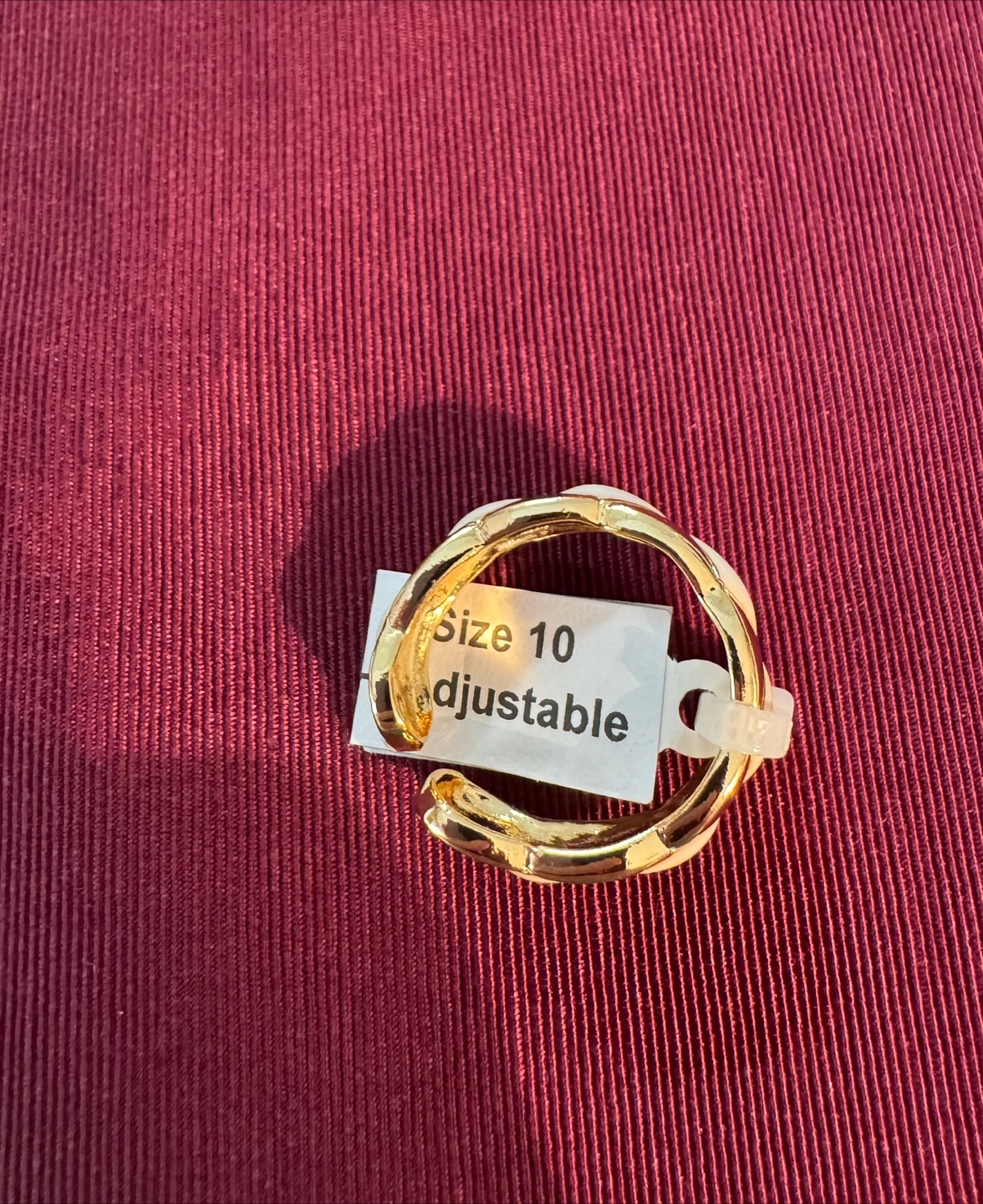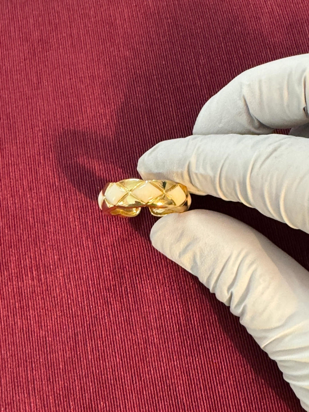 The Cushion Cut Quilted Channel inspired design is 14K Gold Dipped with handmade Enameled in IVORY. Adjustable Ring