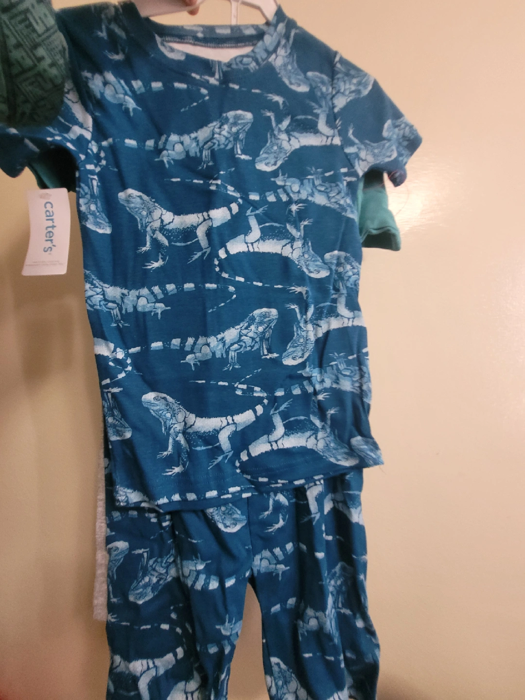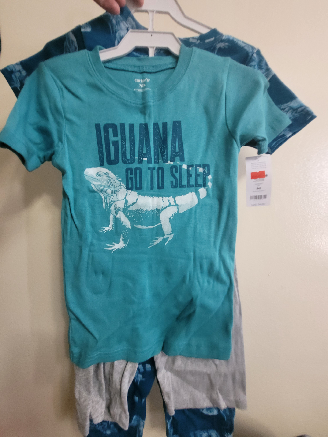 carter's pajama set for boys, size 7. One set is blue with an iguana print, and the other is teal with an iguana graphic that says 'Iguana Go To Sleep'. Perfect for your little one! 4 pieces, shirts and 2 shors