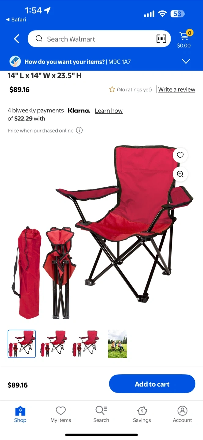 Red folding kids camp chair, perfect for outdoor adventures! It comes with a convenient carry bag for easy transport. Originally priced at $89.16