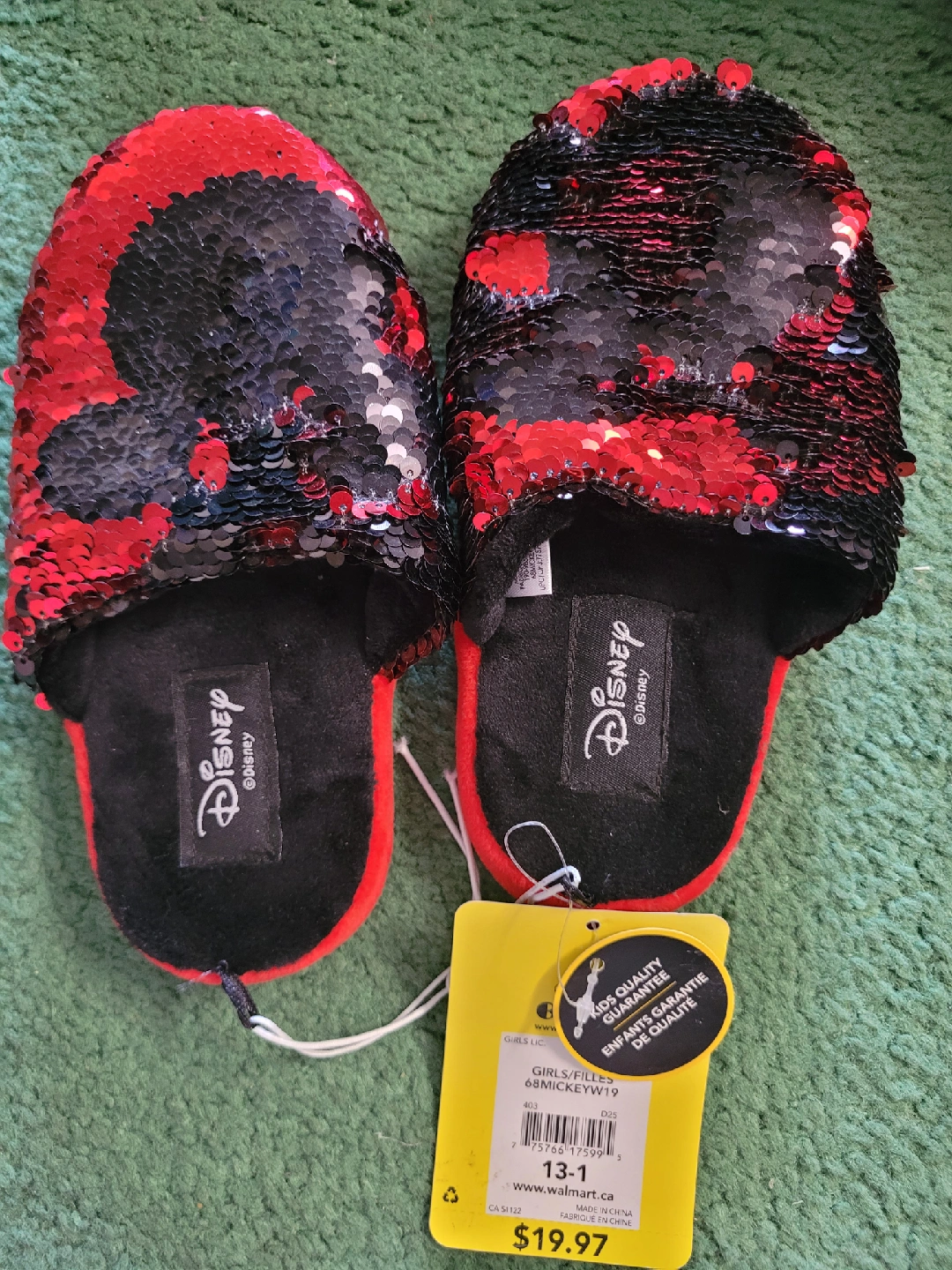 These adorable Disney Minnie Mouse slippers are perfect for your little one! They feature a fun sequin design in red and black. you can play with them and chnage colours by flipping sequins. Size 13-1. Originally bought for $19.97.
