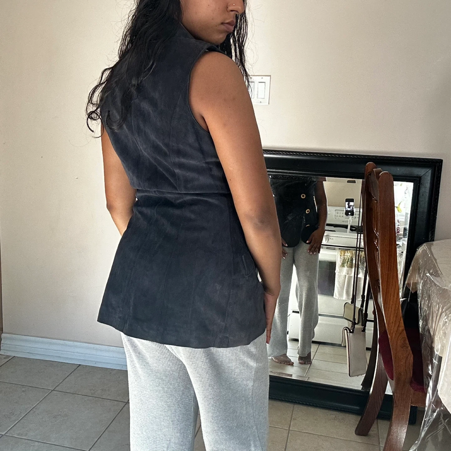 This vintage & in beautiful condition vest is the perfect piece for any outfit! - I really love this and don’t want to sell but it doesn’t leave the closet much - It has gorgeous detailed stitching on the front for a snatched look when worn - Colour is a really dark navy almost black - Inside of the vest is a dark berry, maroon colour - The 4 buttons on front are all original & are in great condition, none are falling off & are metal - the length of this vest is 29 inches & is size XSMALL - There are 2 deep pockets on the front, they are 7 - 6.5 inches deep - It has no smell at all & has not been in a house with smokers or pets. - Lovely 90s retro throwback piece