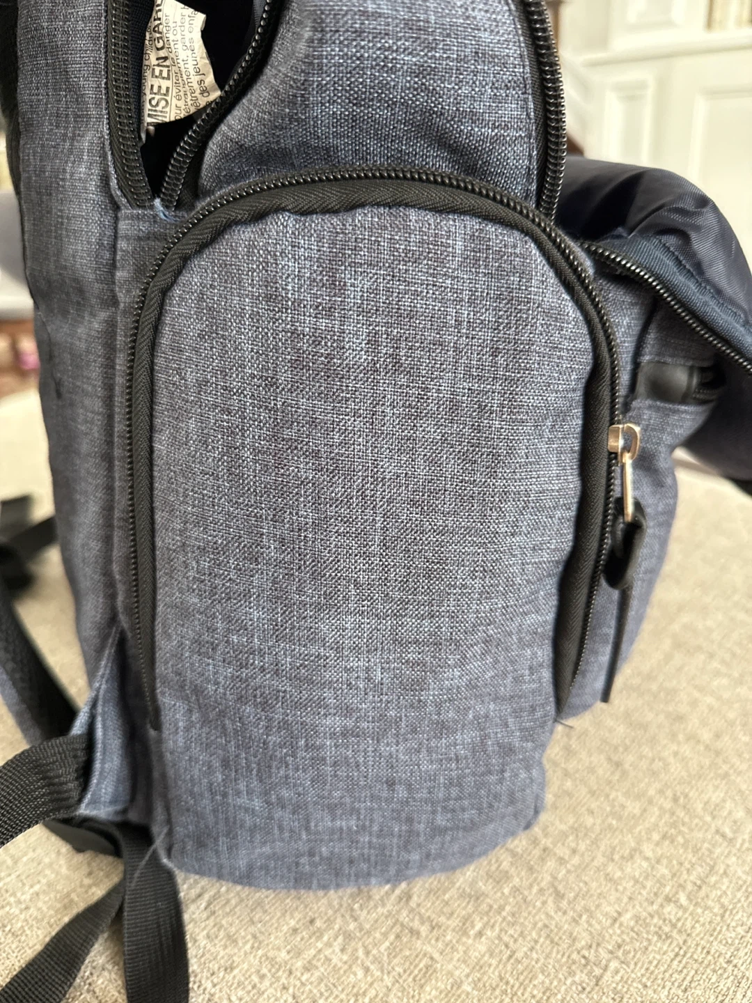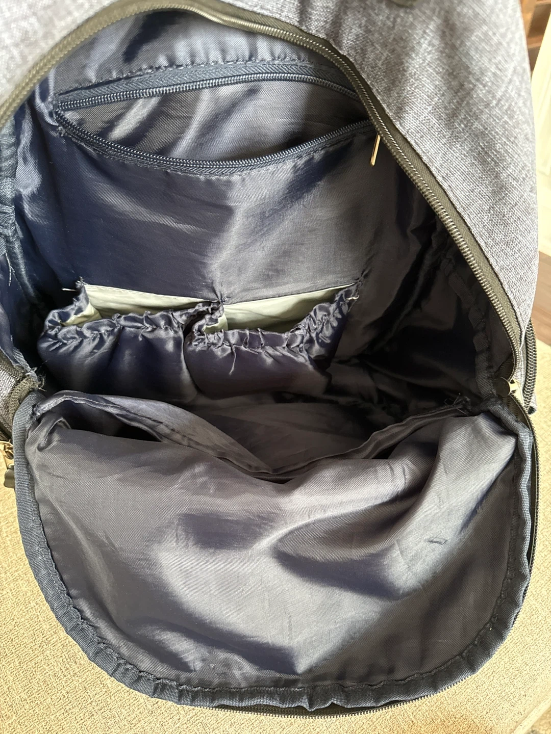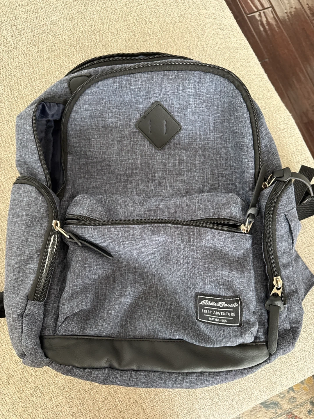Eddie Bauer First Adventure diaper bag backpack in grey. It has several zippered compartments for easy organization. Pick up at O’Connor and Parkview