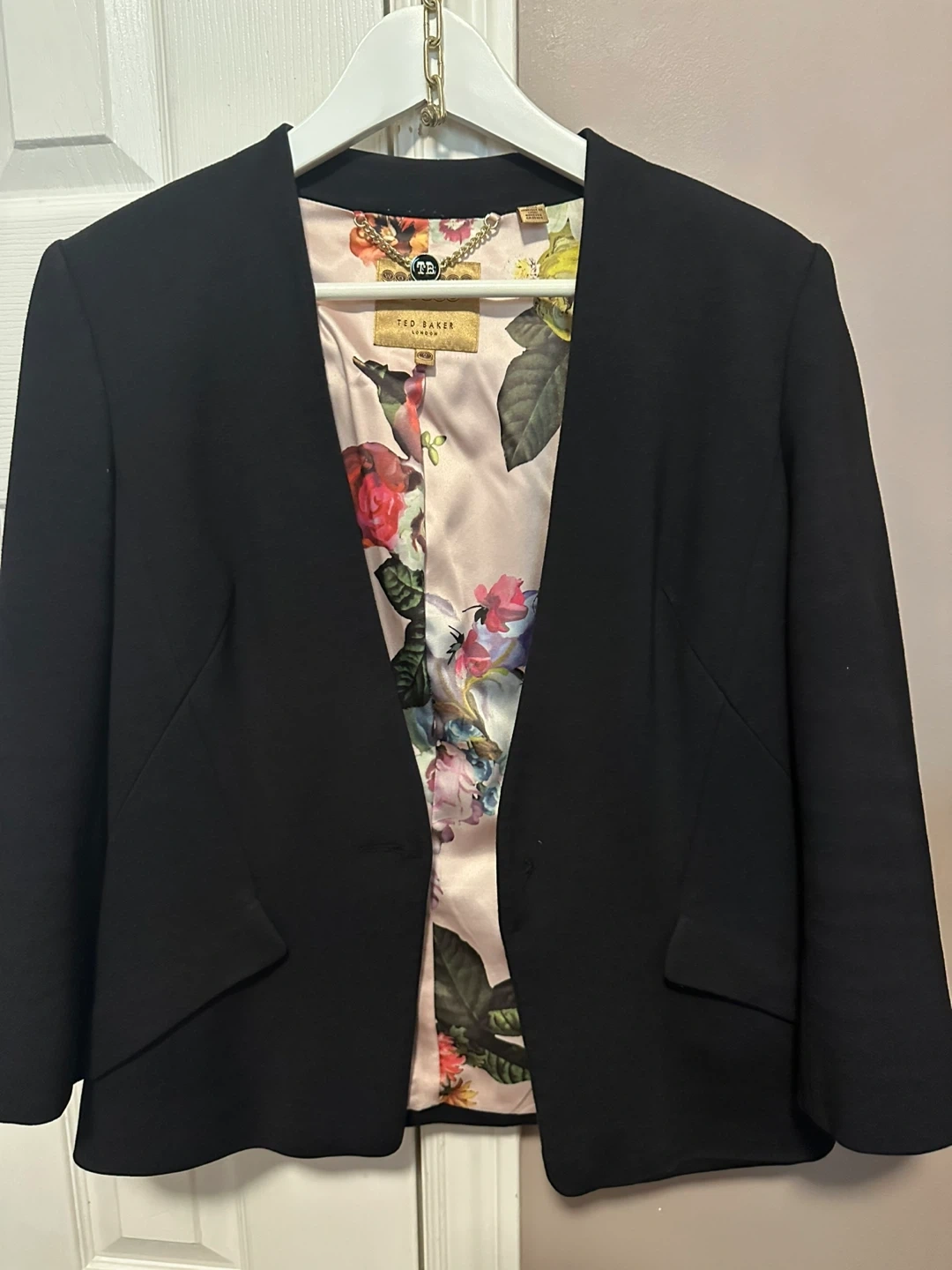 A stylish black blazer from Ted Baker in size 2. The blazer features a unique floral lining, adding a touch of elegance and sophistication. It's in great condition and ready to elevate your wardrobe!