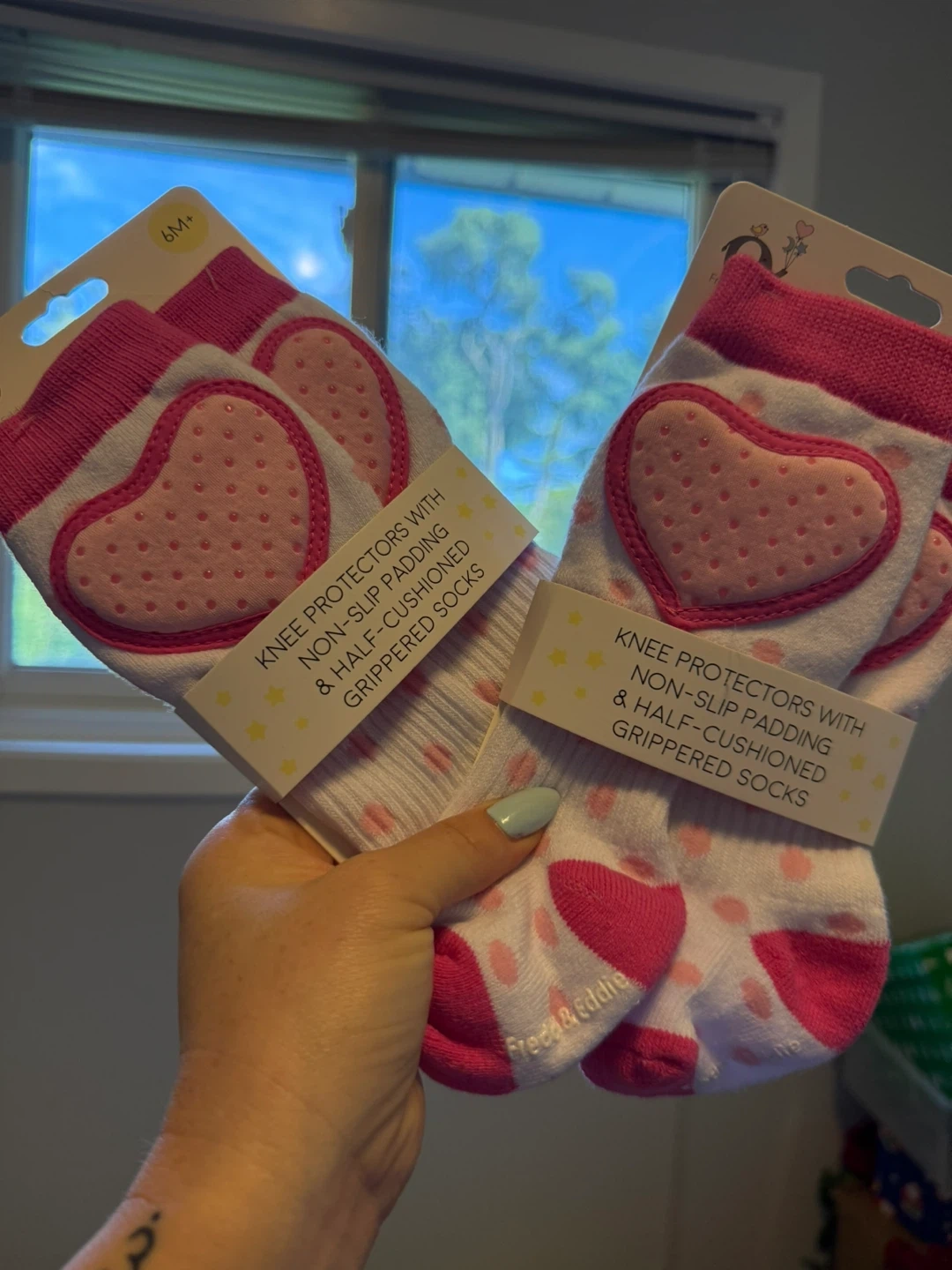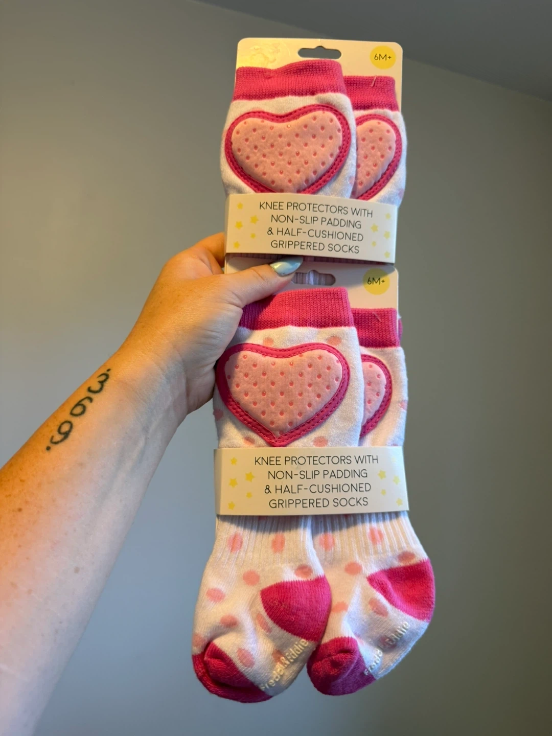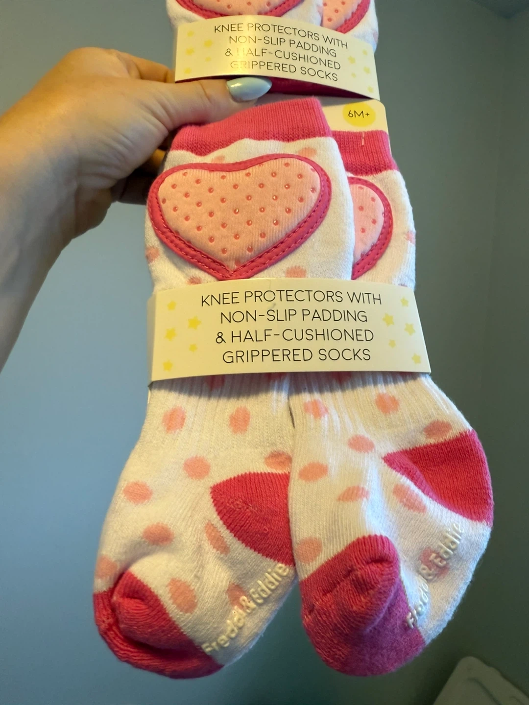 These Freda & Eddie knee protector socks are perfect for little ones learning to crawl! They feature non-slip padding and half-cushioned gripper socks to help keep your baby safe and comfortable. Recommended for ages 6 months and up