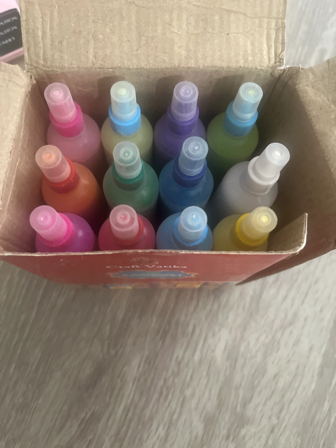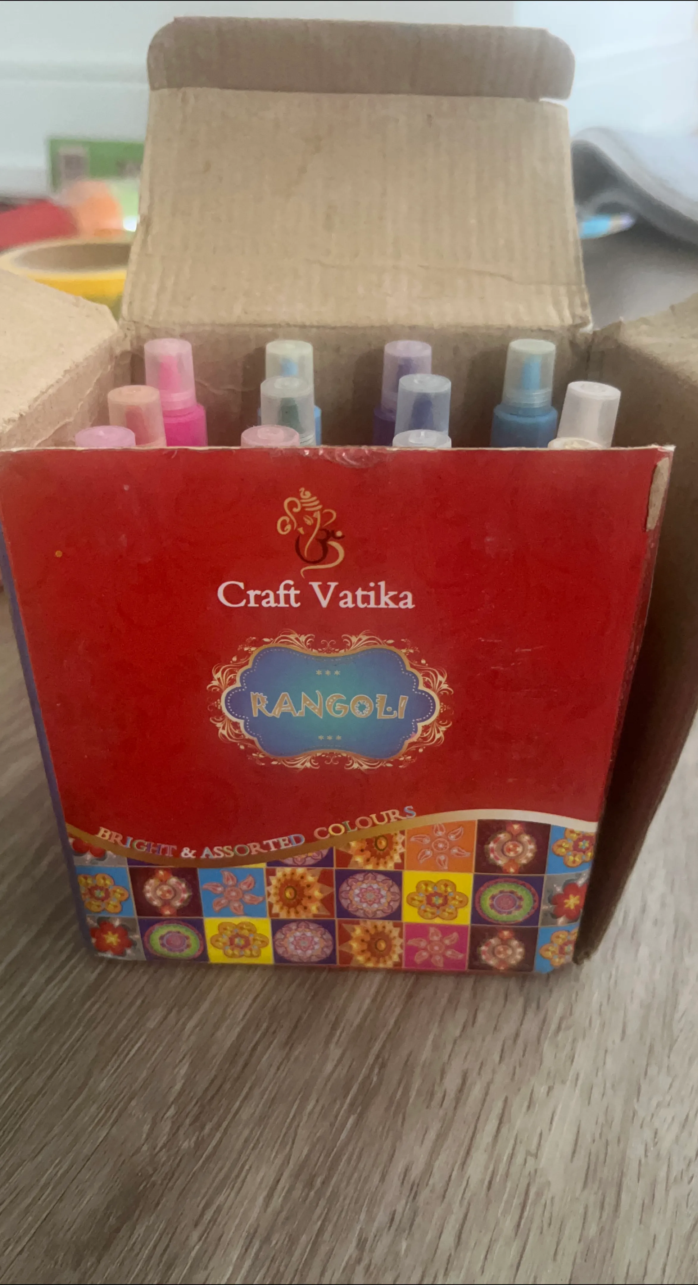 I'm selling a box of Craft Vatika Rangoli colours. These are bright and assorted and come in a box of 12 bottles. Perfect for creating beautiful rangoli designs