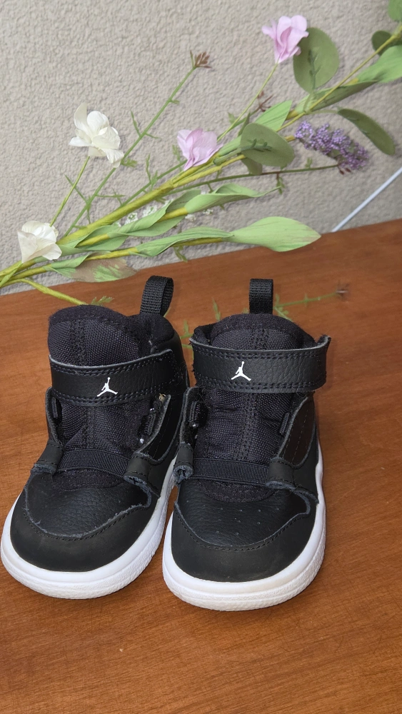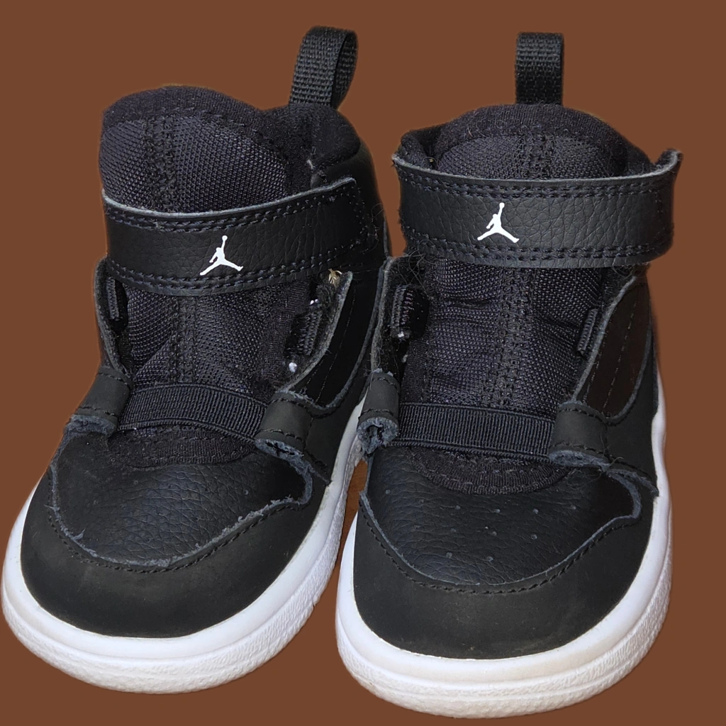 Selling a pair of Jordan toddler shoes in size 5C. They're black with a white sole and the classic Jordan logo on the side. Perfect for your little one!