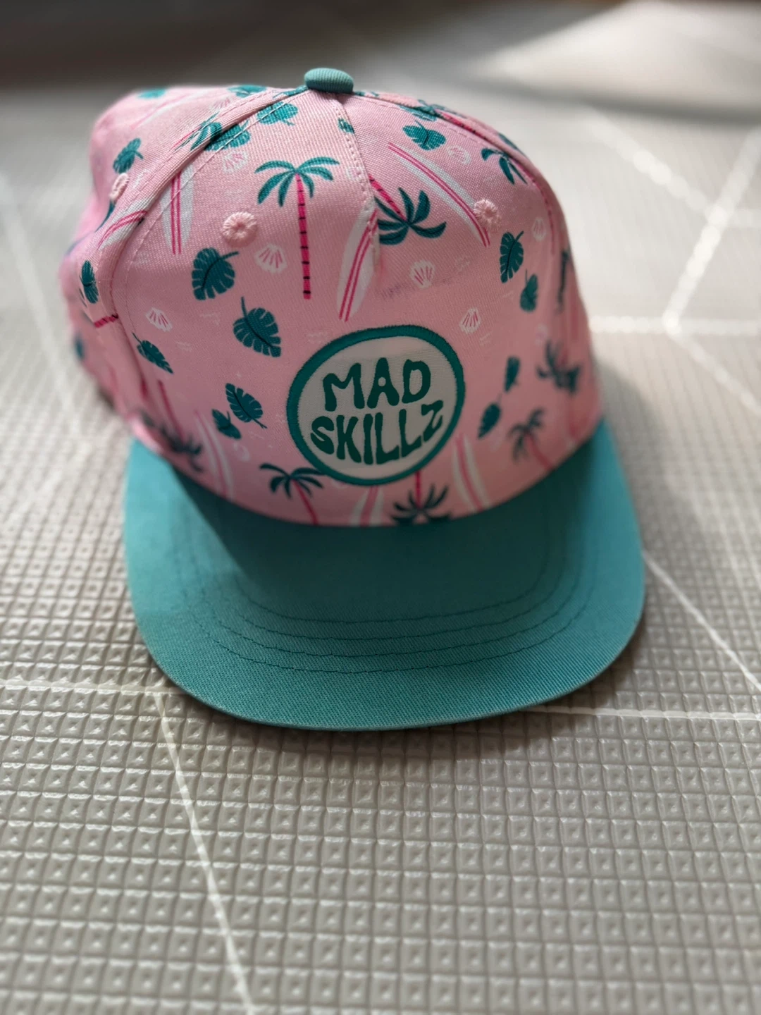 This Mad Skillz cap features a fun tropical design in pink, teal, and white! The size is OS/TU (one size fits most). The crown is made of 100% polyester, and the peak is 100% cotton. Perfect for sunny days!