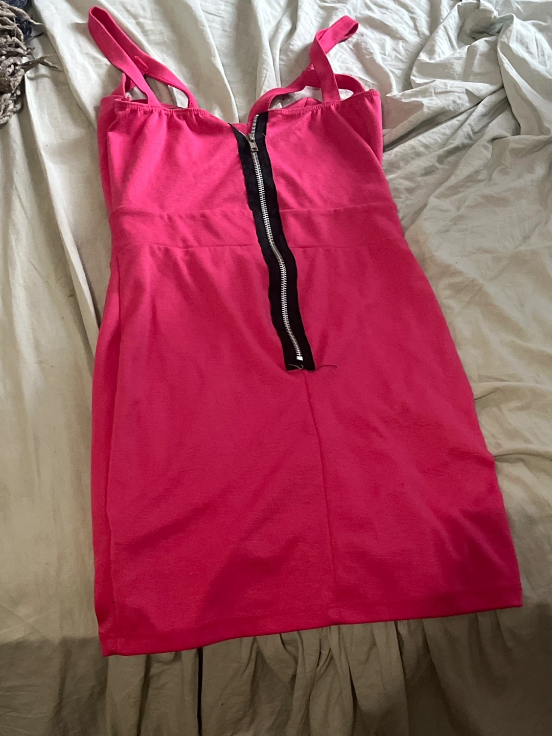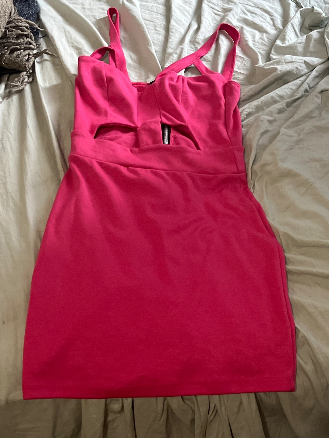 Selling a cute pink mini dress! It has a zipper detail and fun cut-out design. Perfect for a night out or a special occasion.