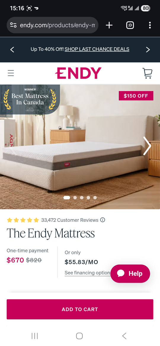 Selling an Endy mattress. It's in great condition and ready for a new home! The Endy mattress is known for being the best mattress in Canada. Originally bought for $820.