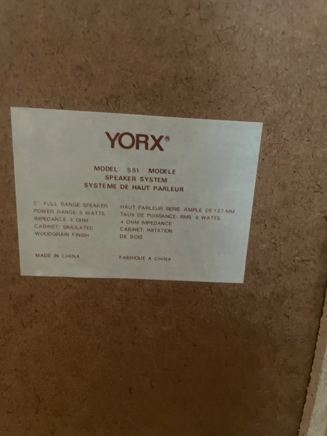 Selling a Yorx S81 speaker system. These are full range speakers with an impedance of 4 ohms. They have a cabinet with simulated woodgrain finish. - Model: S81 - Power Range: 8 Watts - 5" Full Range Speaker