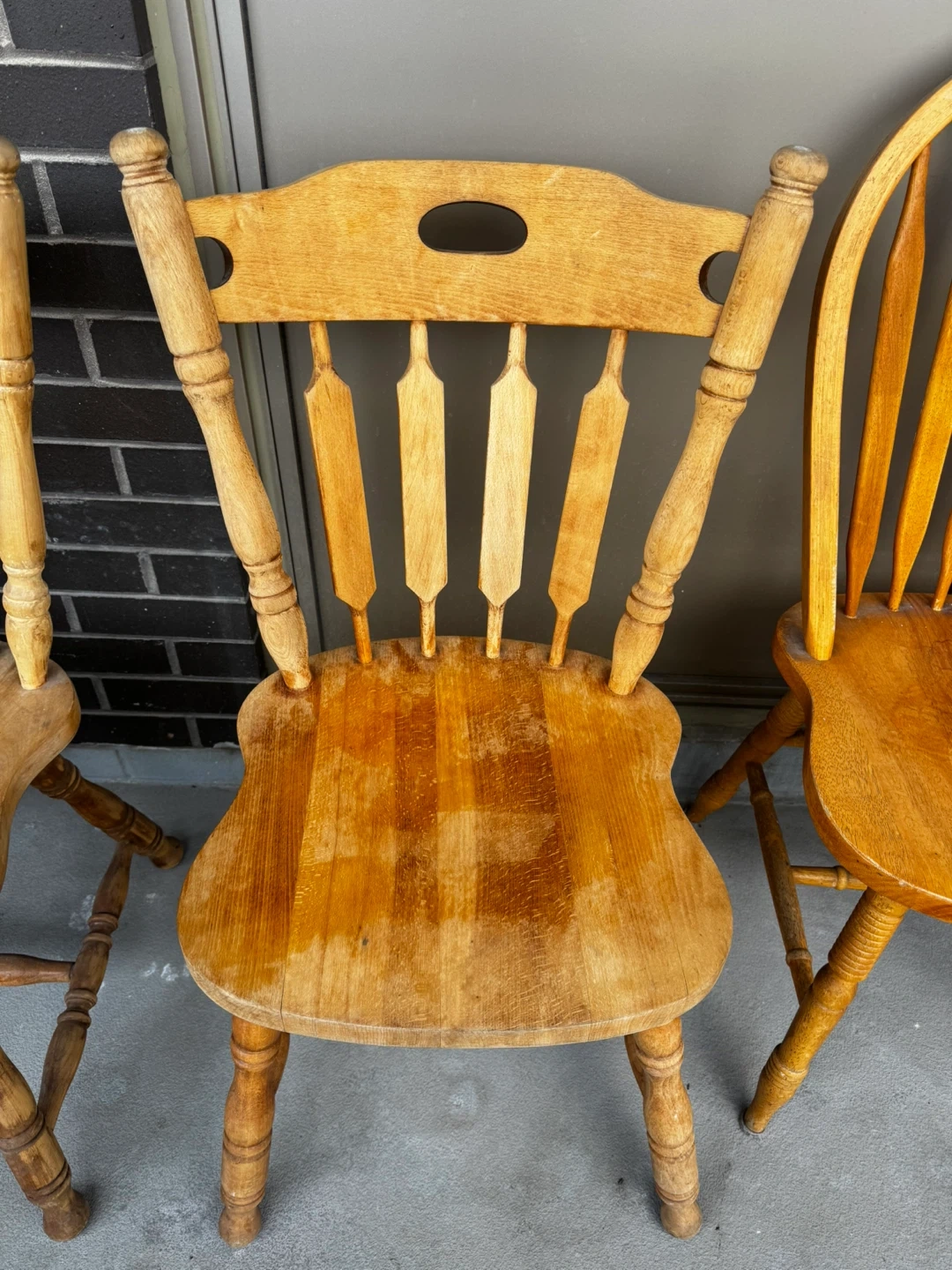 Selling a set of two wooden dining/garden chairs. They're in good condition and would be perfect for a kitchen or dining room or outdoor use.The chairs have a classic design and sturdy construction.