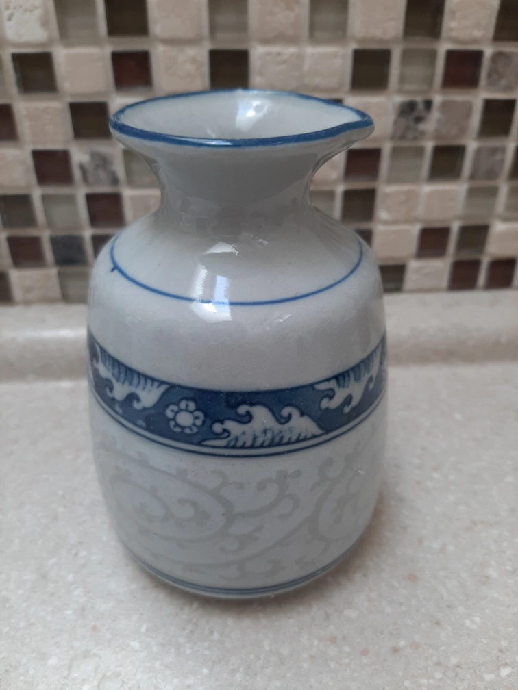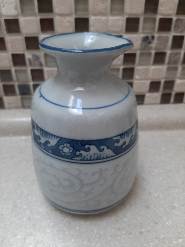 Here's a cute ceramic sake pitcher! It's white with a blue pattern around the middle. Perfect for serving sake or just as a decorative piece