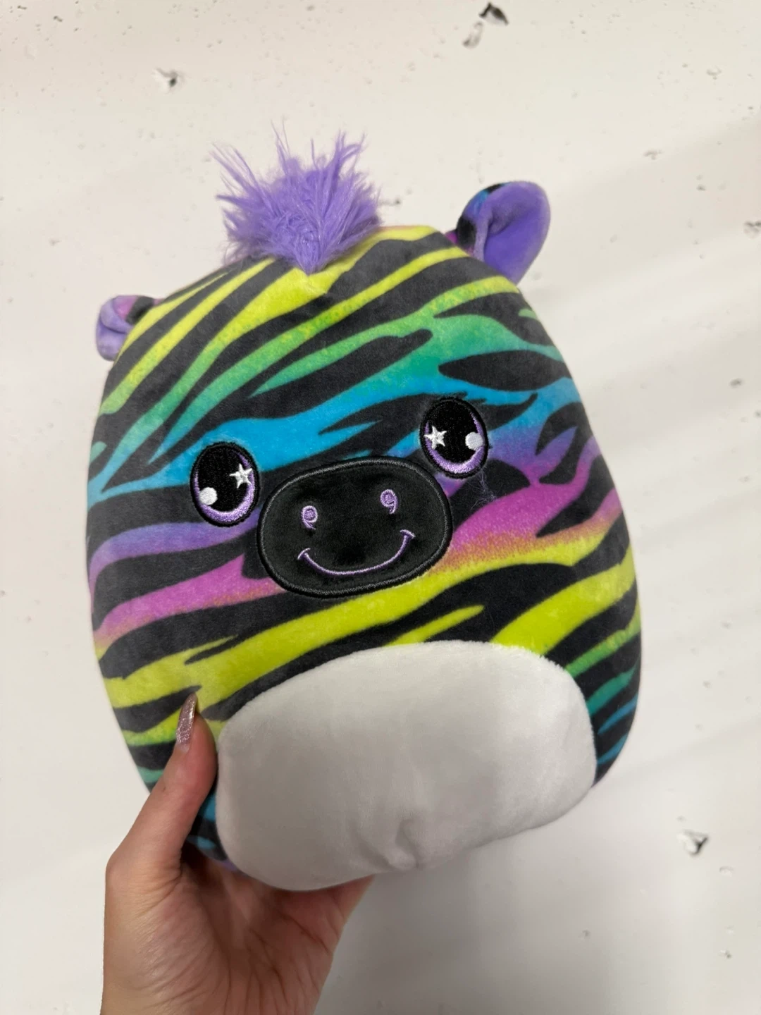 Looking to sell this cute Squishmallows Mystery Squad plush! It's a zebra with rainbow stripes and purple hair. It's in great condition and ready for a new home!