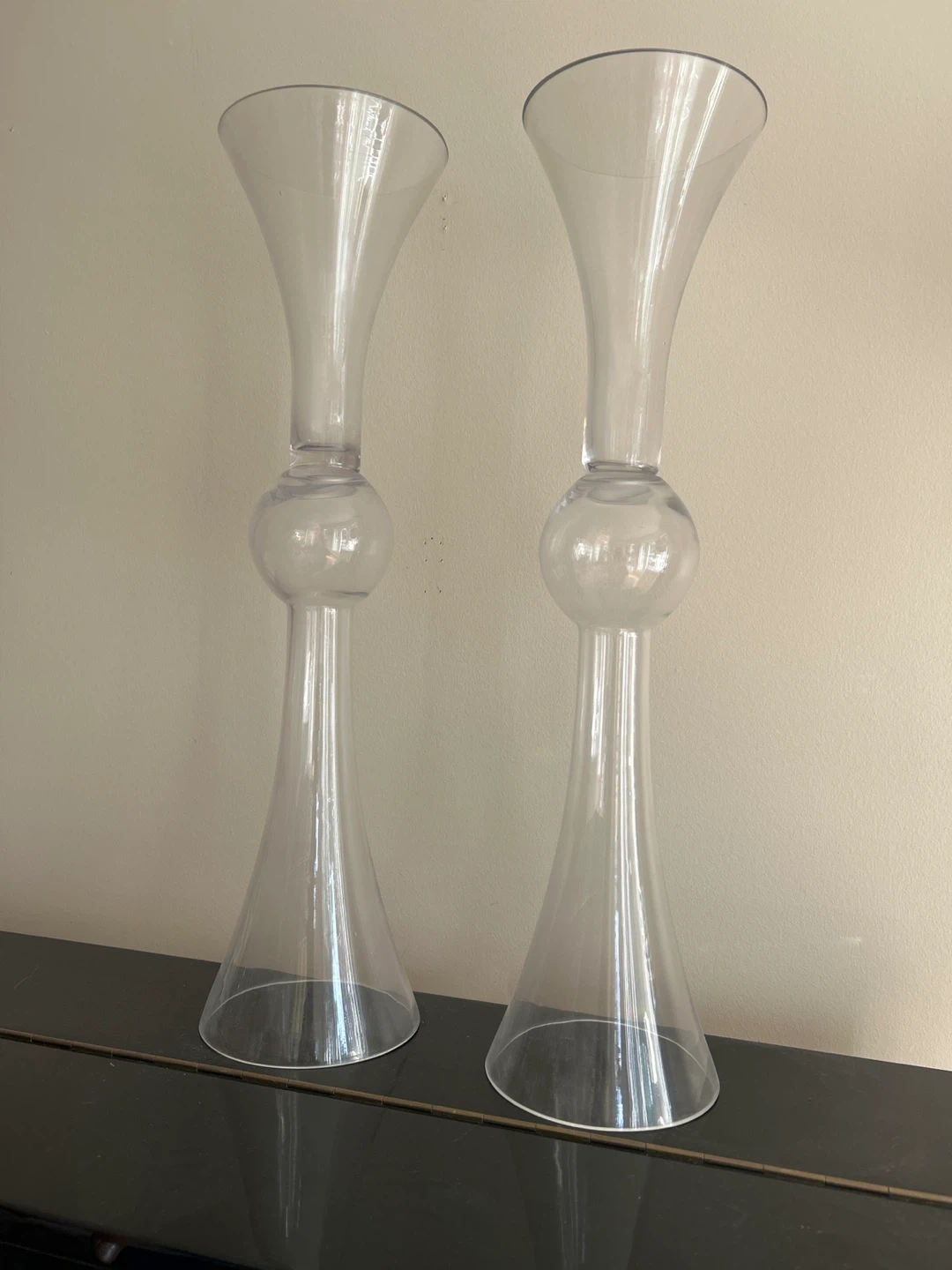 Selling a set of two tall, clear glass vases. They're in great shape and would be perfect for centrepieces or adding a touch of elegance to any room. They have a unique design that would look great with flowers or as standalone decorative pieces