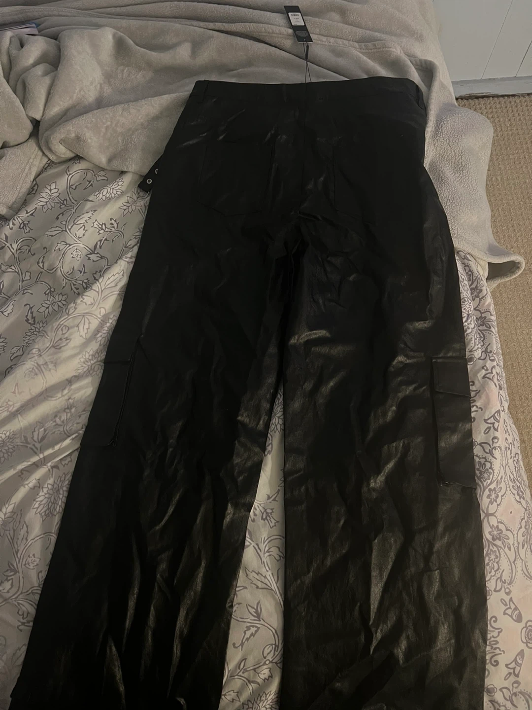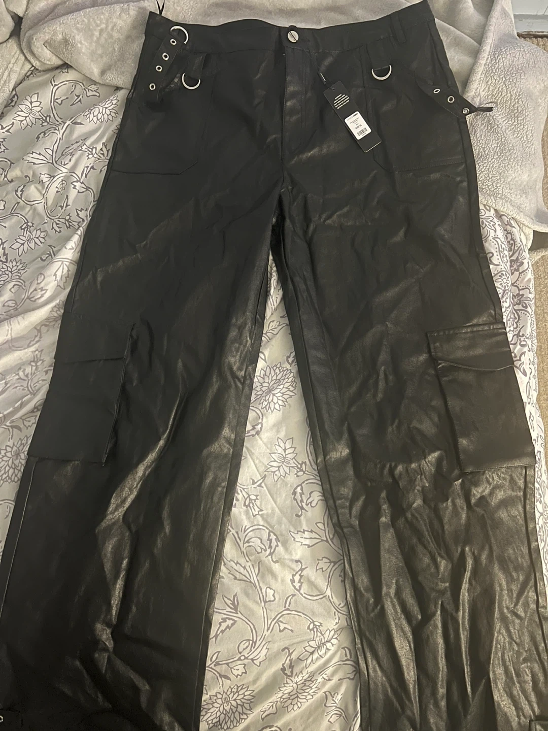 Selling a pair of black faux leather cargo pants. They're in great condition (brand new) and feature a stylish cargo design. Perfect for adding an edgy touch to your wardrobe!