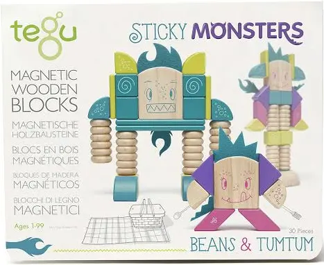 These Tegu Sticky Monsters magnetic wooden blocks are a super fun way to get creative! The set is called Beans & Tumtum and includes 30 pieces. Great for ages 1-99!