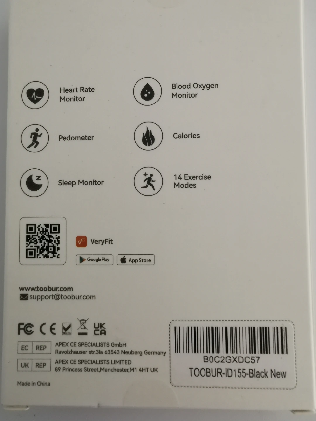 Track your fitness goals with this new TOOBUR fitness tracker. This sleek, black tracker monitors your heart rate, sleep patterns, and activity levels with its 14 sport modes. It's also waterproof with an IP68 rating, making it perfect for any workout.