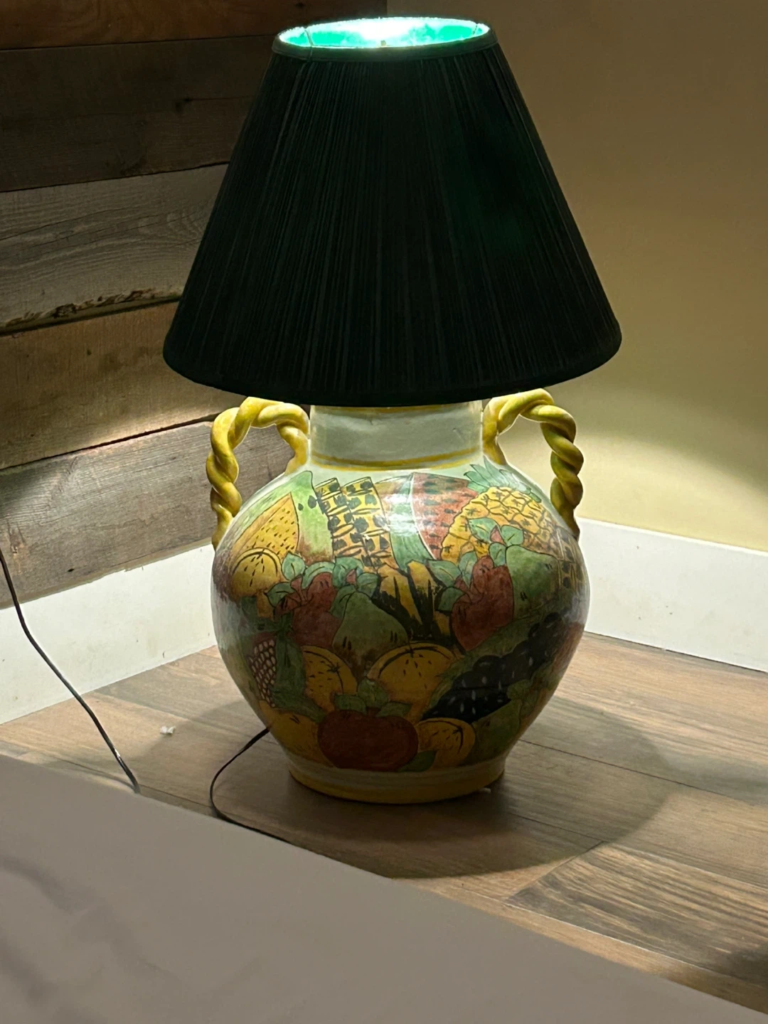 Selling a unique vintage ceramic table lamp! It features a colourful fruit design on the base and comes with a green pleated shade. It would be a great addition to any room