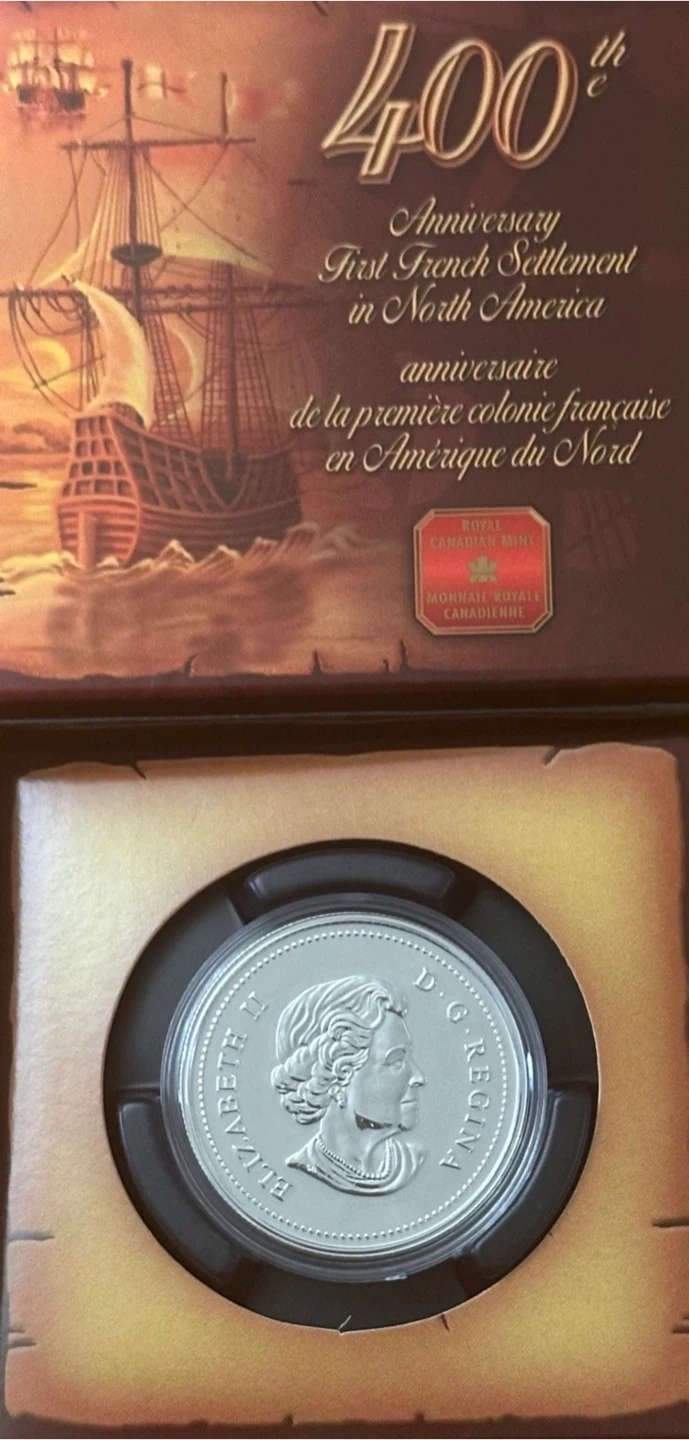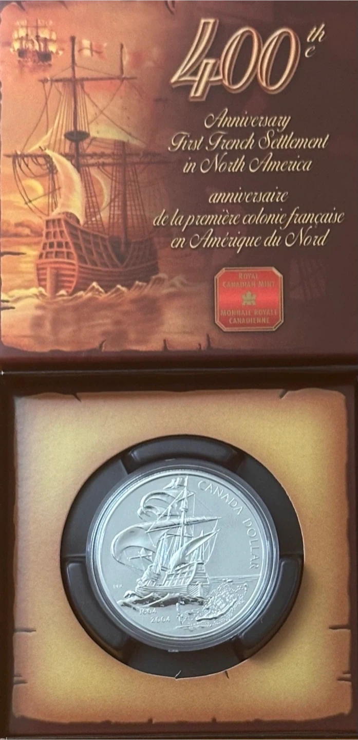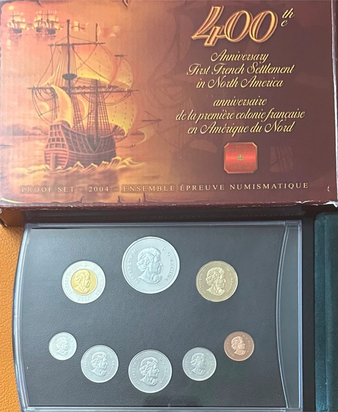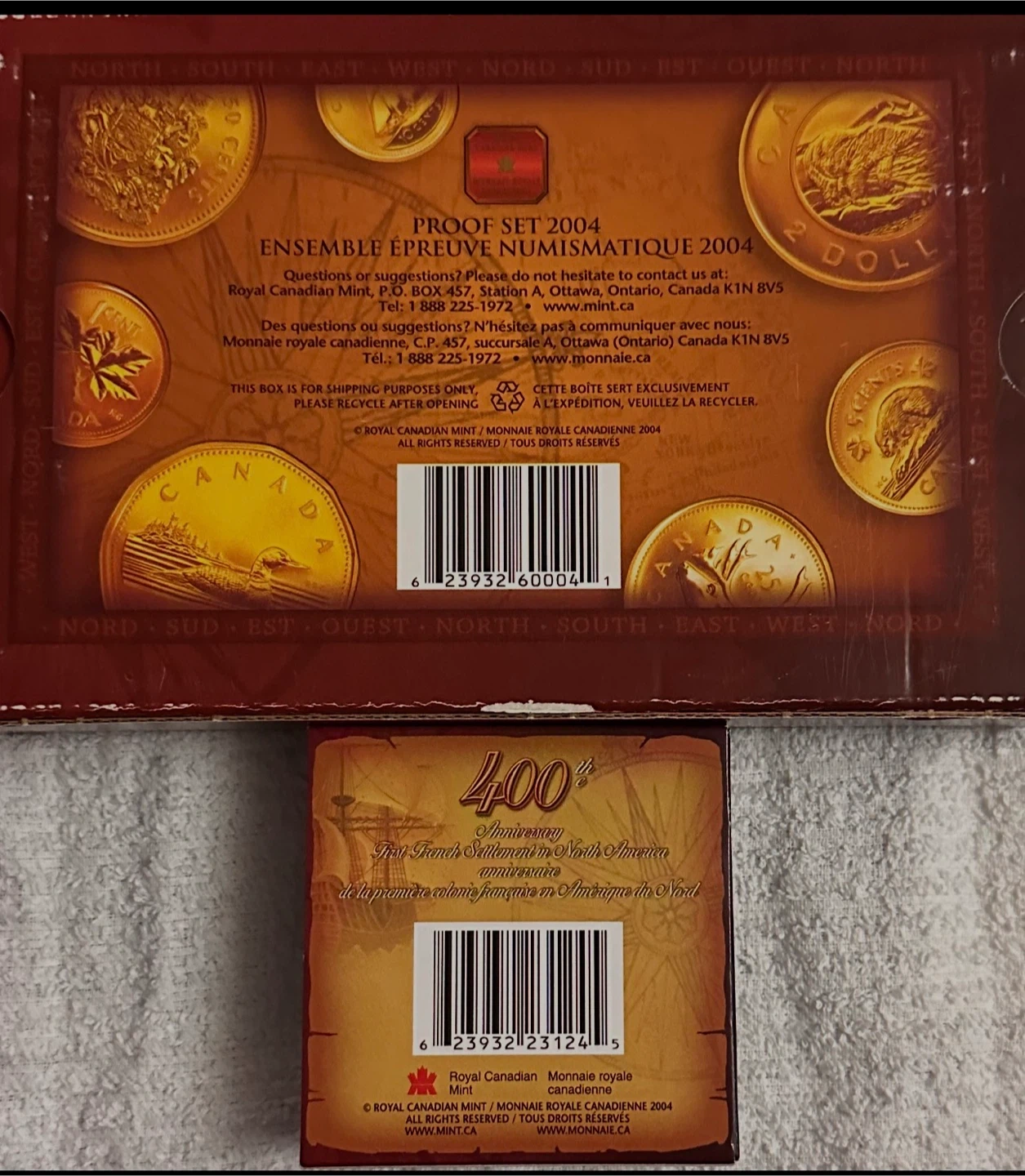 Selling a Royal Canadian Mint 2004 Silver Proof Set package. It commemorates the 400th Anniversary of the First French Settlement in North America. The set includes various Canadian coins from that year, and one Silver Dollar. 2 boxes in total…