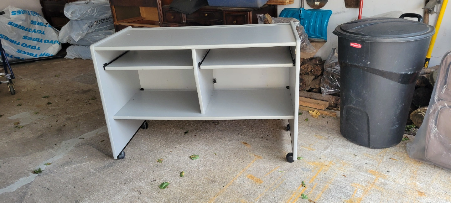 Selling a handy grey rolling desk! It's got a smooth top and some shelves for storage. Great for a home office or study space. It's in good shape and ready to roll into your place