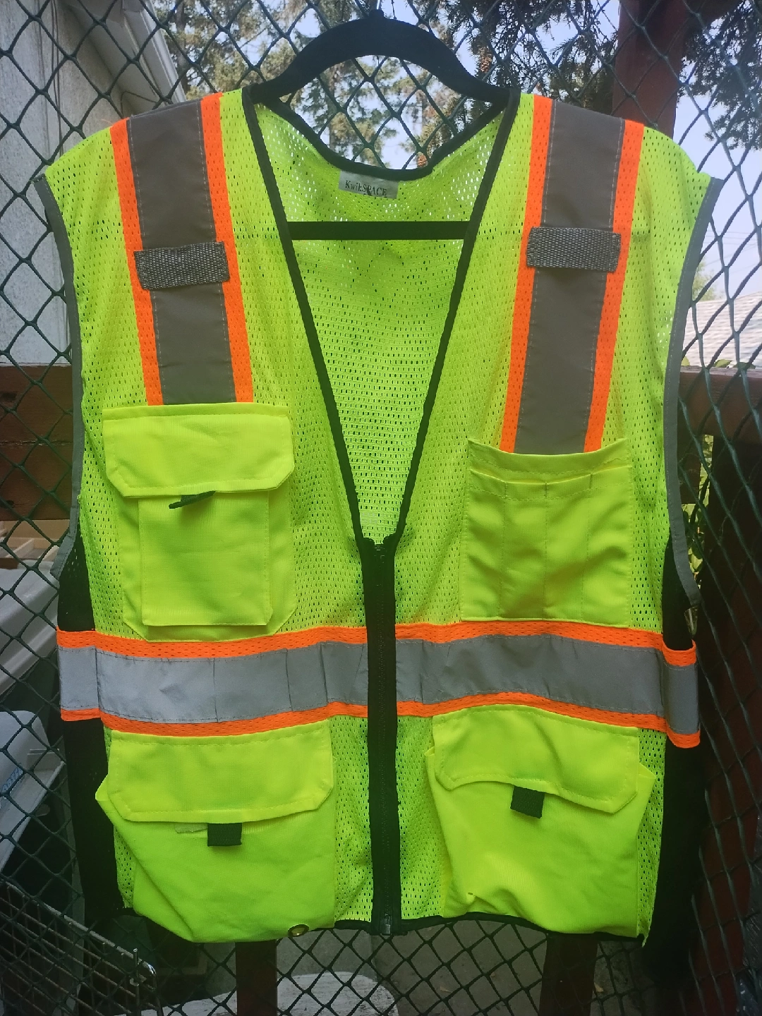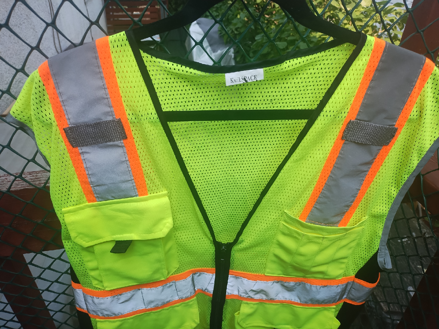 Selling a one piece KwikSPACE safety vest, neon yellow with reflective strips, mesh sides, front zipper and multiple pockets for storage. Perfect for any activity that requires high visibility. Like new, clean condition.