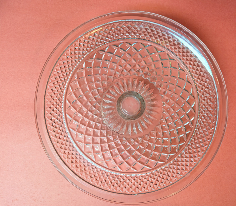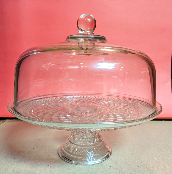 Selling a lovely glass cake stand with a dome. It's perfect for displaying your baked goods and keeping them fresh. The stand has a beautiful patterned design. It would make a great addition to any kitchen or dining room