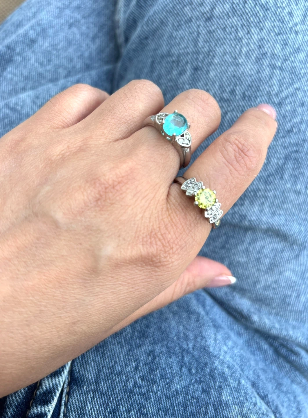 Selling a couple of gemstone rings! One has a yellow stone (US size 8) and the other has a blue stone(US size 7). Both are set in a silver-tone metal with smaller clear stones.