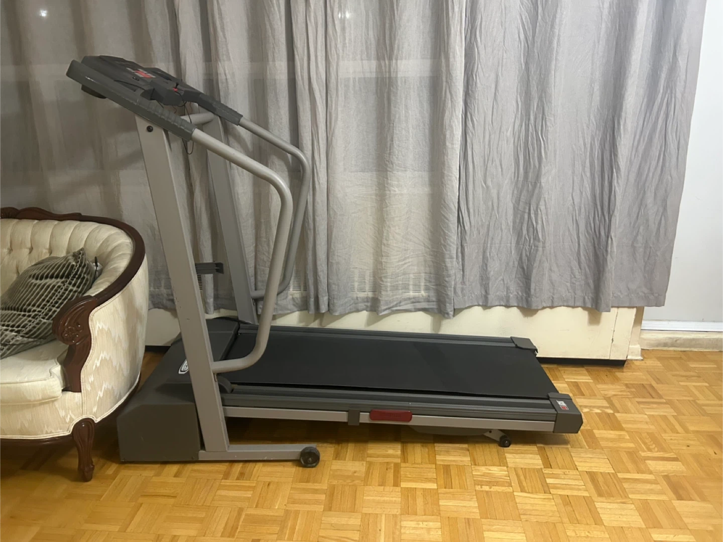 Selling a treadmill in good condition. It features a display showing heart rate training zones, time, distance, fat calories, and speed. It also has controls for incline and speed adjustments to customize your workout