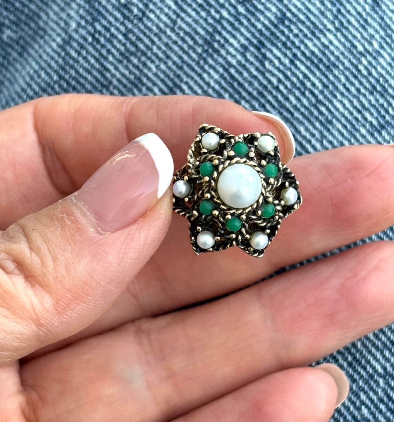 Selling a beautiful vintage ring by Sarah Coventry. It features a unique floral design with faux pearls and green stones. The center faux pearl has some scratches but hardly noticeable. It’s a lovely piece to add to your collection!!🥰🥰💐💐 US Size: 6 but fit 7 too!