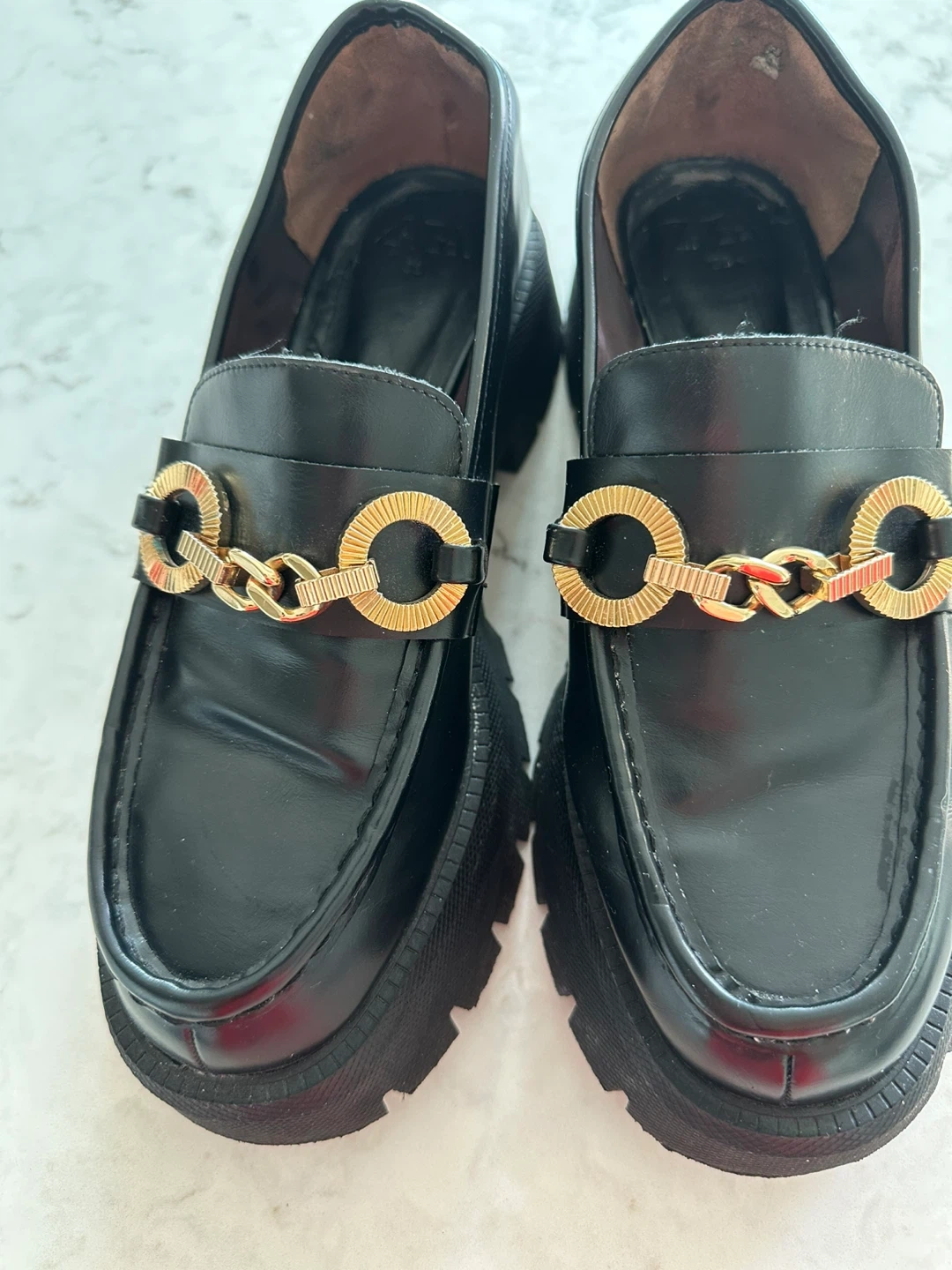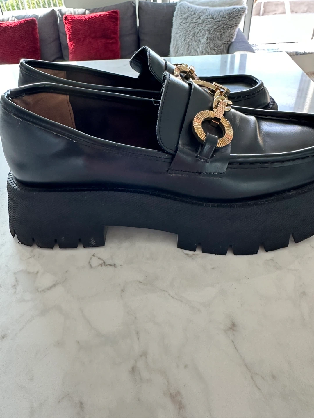 Selling a pair of Zara black loafers in size 38. They have a chunky sole and gold chain detail. Perfect for adding a bit of edge to your outfit!