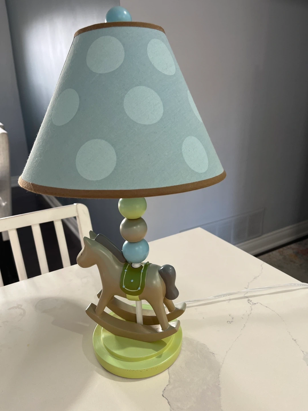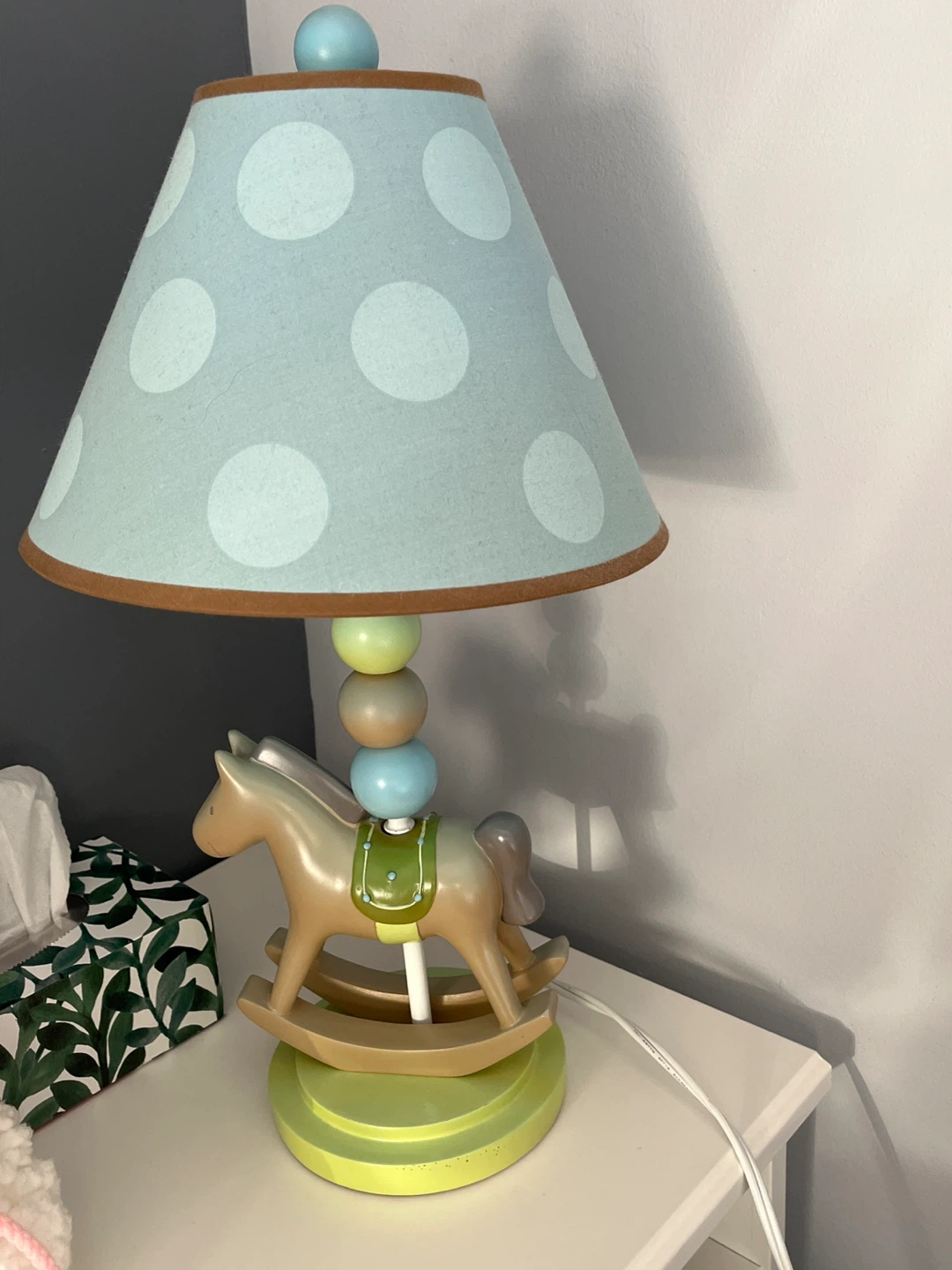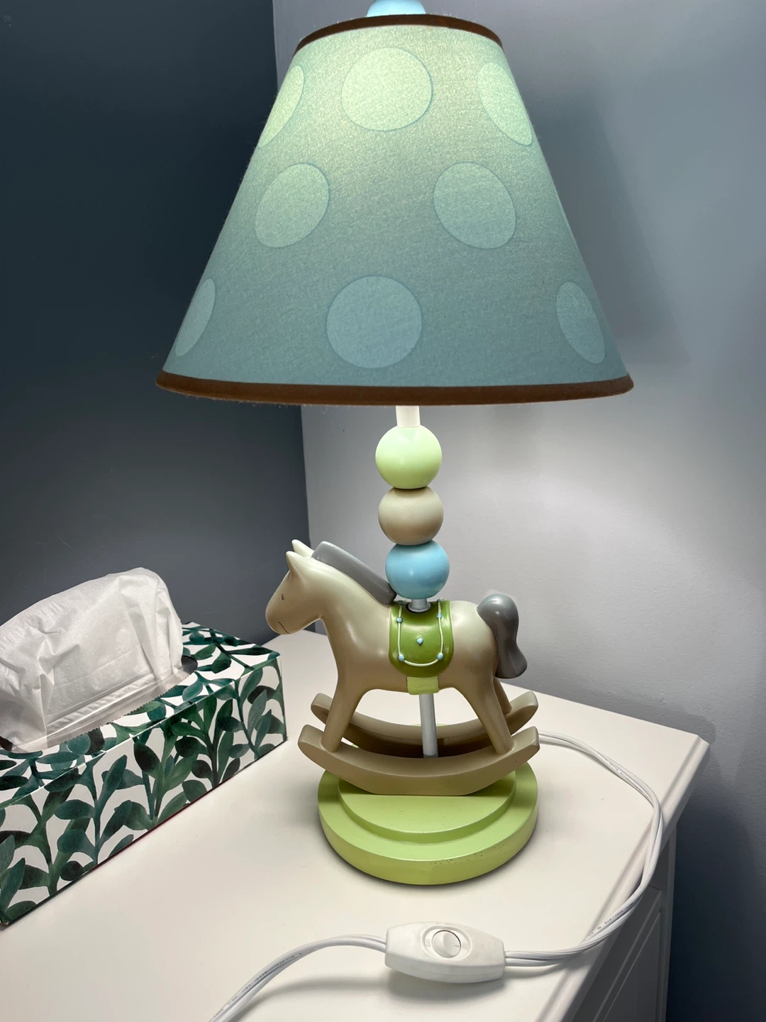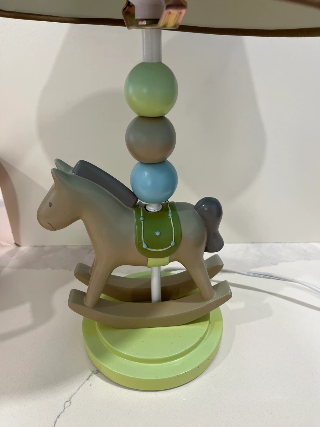 A cute rocking horse lamp, perfect for a kid's room or nursery! The lampshade is a light blue .The base features a rocking horse and colourful wooden balls. It's in great condition and ready to brighten up any space
