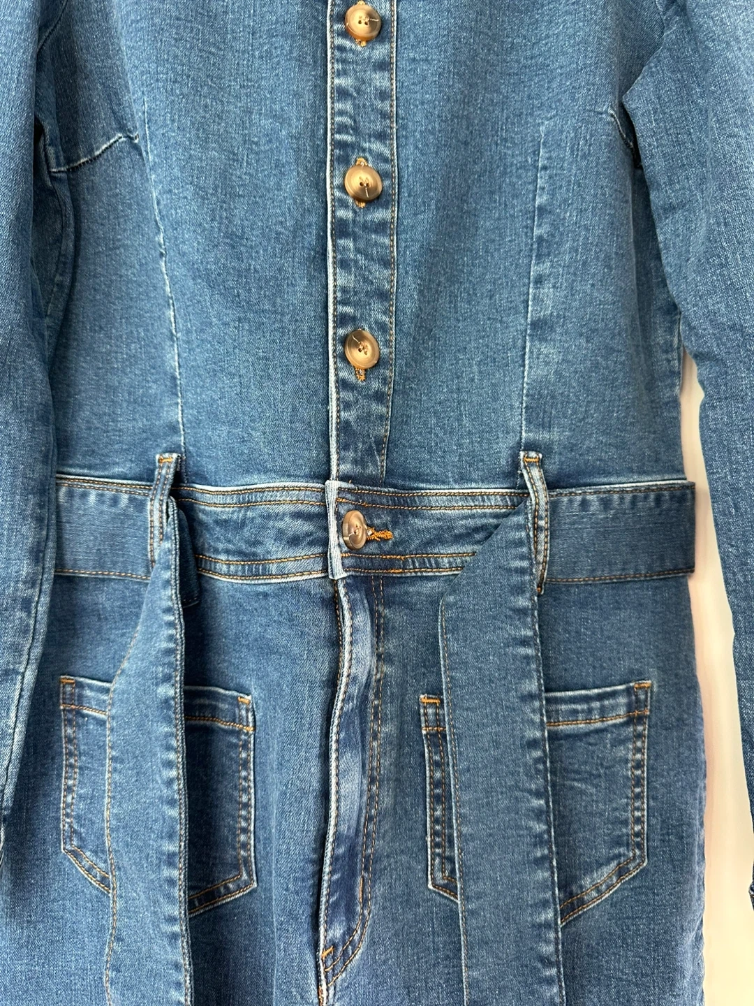 Selling a stylish denim jumpsuit from NAF NAF Paris! It's a size 38 and features a flattering belted waist and button-up front. Perfect for a casual yet chic look New never worn