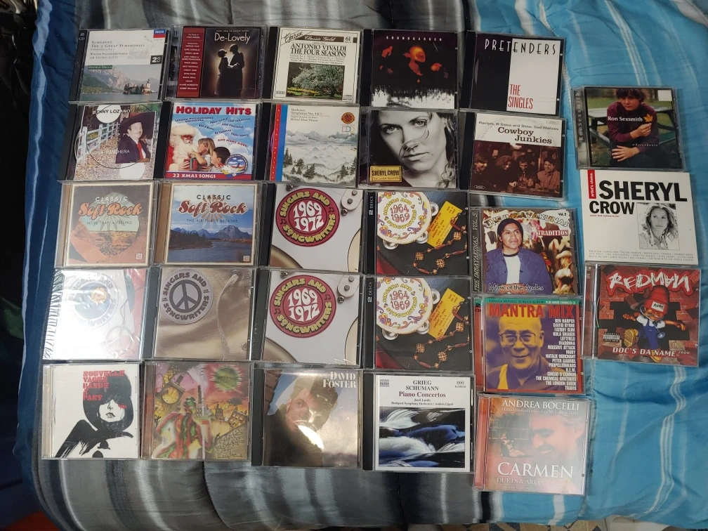 Selling a collection of 28 CDs featuring various artists and genres! 22 Holiday Christmas Hits $10 A Tribe Called Quest - Beats, Rhymes And Life 3D Cover $20 Antonio Vivaldi - The Four Seasons (slight scratch) $5 Beethoven Symphonies Nos. 4 & 5 $10 Benny Lozano - Mexican Serenade $20 Bizet Carmen Duets & Aria, Bocelli, Domashenko, Mei, Terfel, Chung $5 Classic Soft Rock: The Air That I Breathe $5 Classic Soft Rock - More Than A Feeling $10 Cowboy Junkies - Rarities, B-Sides and Slow, Sad Waltzes $10 David Foster Self Titled $5 Grieg Schumann - Piano Concertos , Jeno Dando, Budapest Symphony Orchestra , Andras Ligeti $5 Music From The Motion Picture: De-Lovely $5 Nouvelle Vague/Bande A Part $10 Pretenders - The Singles $5 Redman - Doc's Da Name2000 $5 Rob Sexsmith - Whereabouts (case needs replacing) $2 Schubert - The 3 Great Symphonies: Symphonies 5, 8 & 9, Wiener Philharmoniker/Solti $10 Sheryl Crow - The Globe Sessions $5 Sheryl Crow - Artist's Choice: Music That Matters To Her $10 New Sealed Singers & Songwriters: The 1960s $20 Singers and Songwriters 1964-1969 $15 New Sealed Singers and Songwriters 1964-1969 $30 Singers and Songwriters 1969-1972 $10 New Sealed Singers and Songwriters 1969-1972 $20 New Sealed Singers and Songwriters: 1973-1975 $15 Soundgarden - Superunknown $5 The Imbayakunas - Music Of The Andes Vol.5 $15 Tibetian Refugee Benefit Album Plus Bonus Enhanced CD Mantra Mix $15
