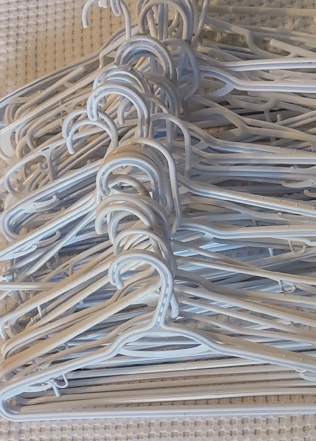 1000+Selling a bunch of white plastic clothes hangers. They're great for keeping your closet organized and tidy!