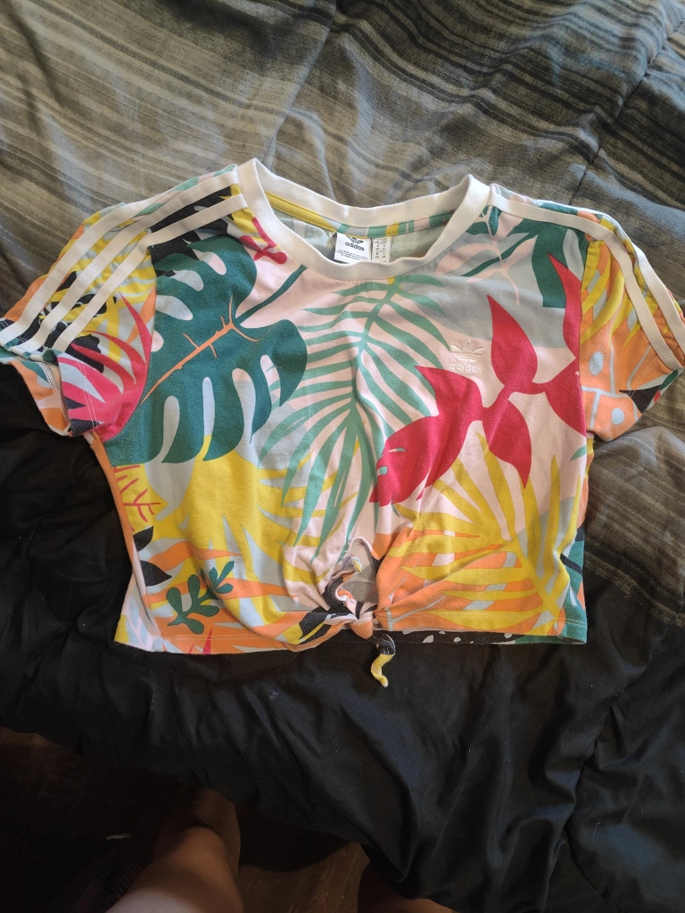 Selling a cute Adidas floral crop top! It's a size medium and has a fun, colourful pattern with the classic Adidas stripes on the sleeves. Perfect for summer!