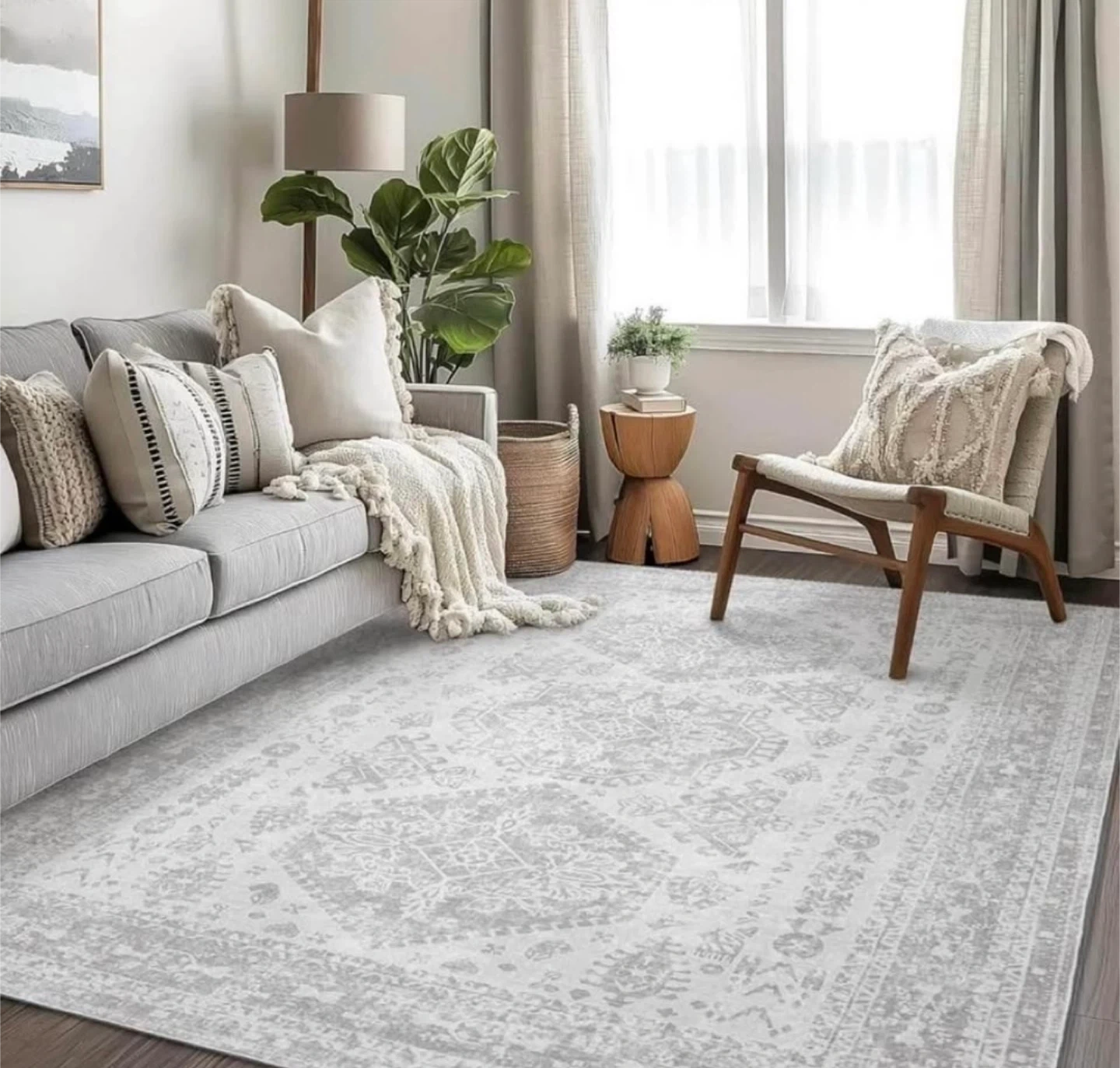Selling a lovely grey area rug in great condition! It's perfect for adding a touch of elegance to any room in your home. The rug features a beautiful pattern and a soft texture, making it both stylish and comfortable. It would look great in a living room or bedroom! Pet and smoke free house