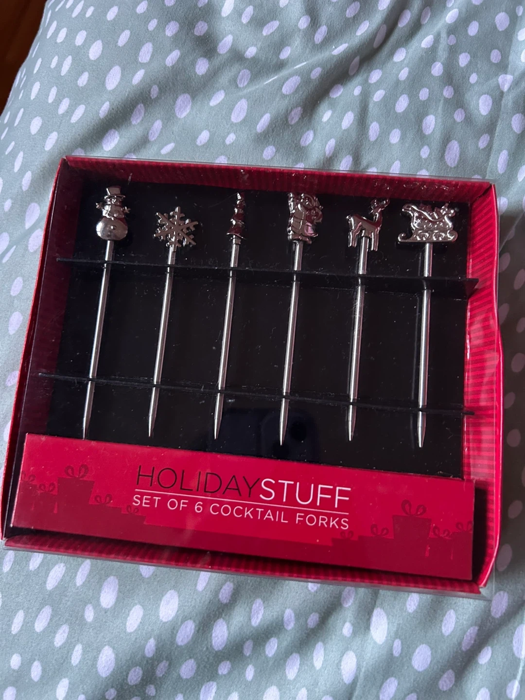 Selling a brand new set of Holiday Stuff cocktail forks. This set includes 6 unique designs. They come in the original box and are ready to use!