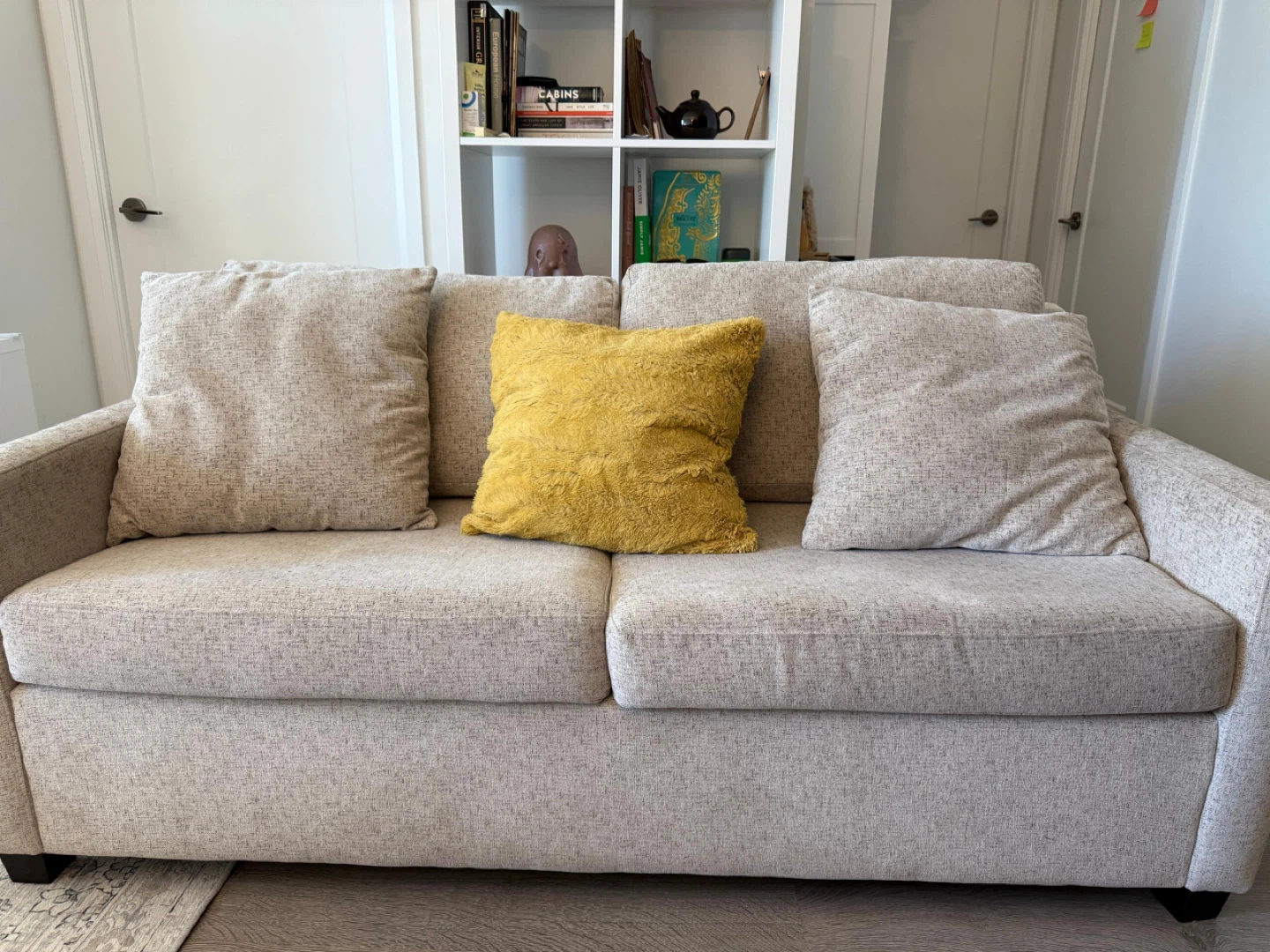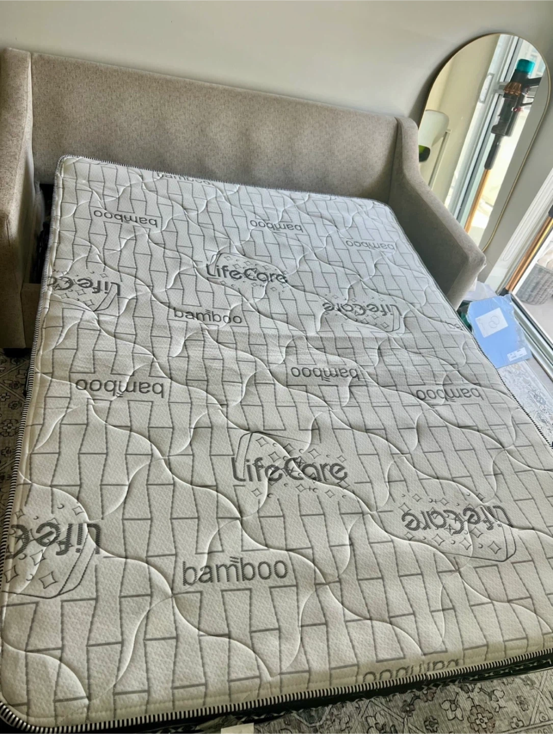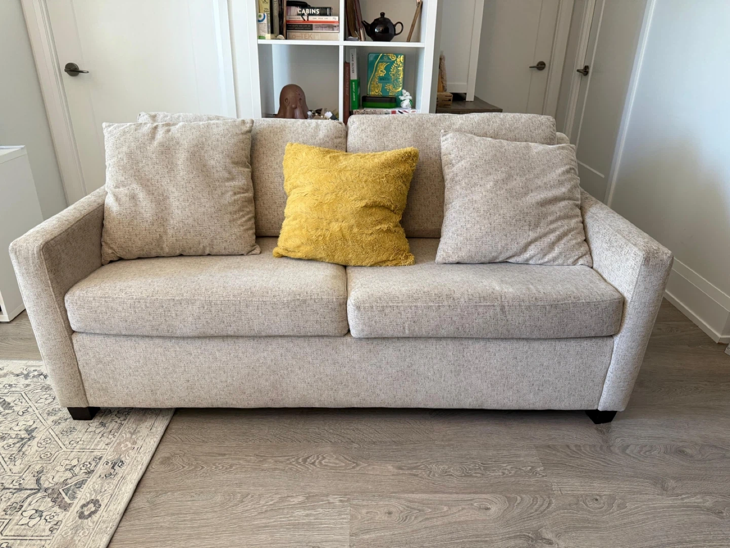 Lovely Chesterfield Mattress Sofa bed. Cushion seat fabrics are washable. Double Bamboo mattress. Yellow pillow NOT INCLUDED. The couch is extremely comfortable, fits three people comfortably, can fit a fourth person too with little squeeze. Colour is like an Ecru white with speckle design. Couch is in good condition, still firm but soft, your body will be glad sitting or laying on this. It feels like heaven. Need to sell as it doesn’t fit in my current apartment but it’s worth the price. Original price $2000 excl. tax but I’m selling it for less than quarter of the original, for $400. If you’re interested please DM me. Please and thank you.