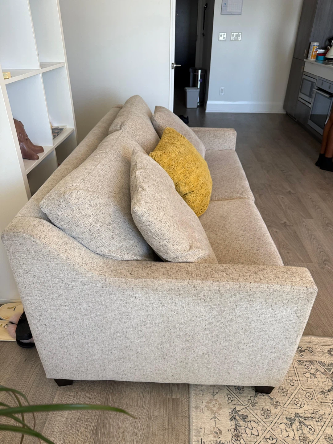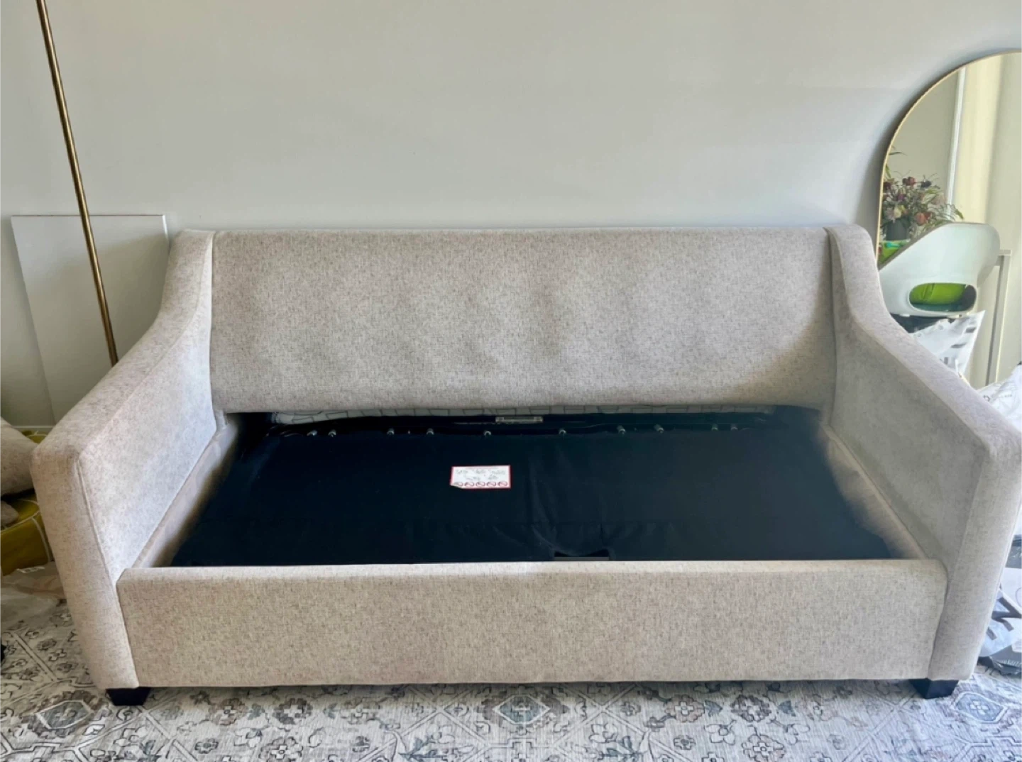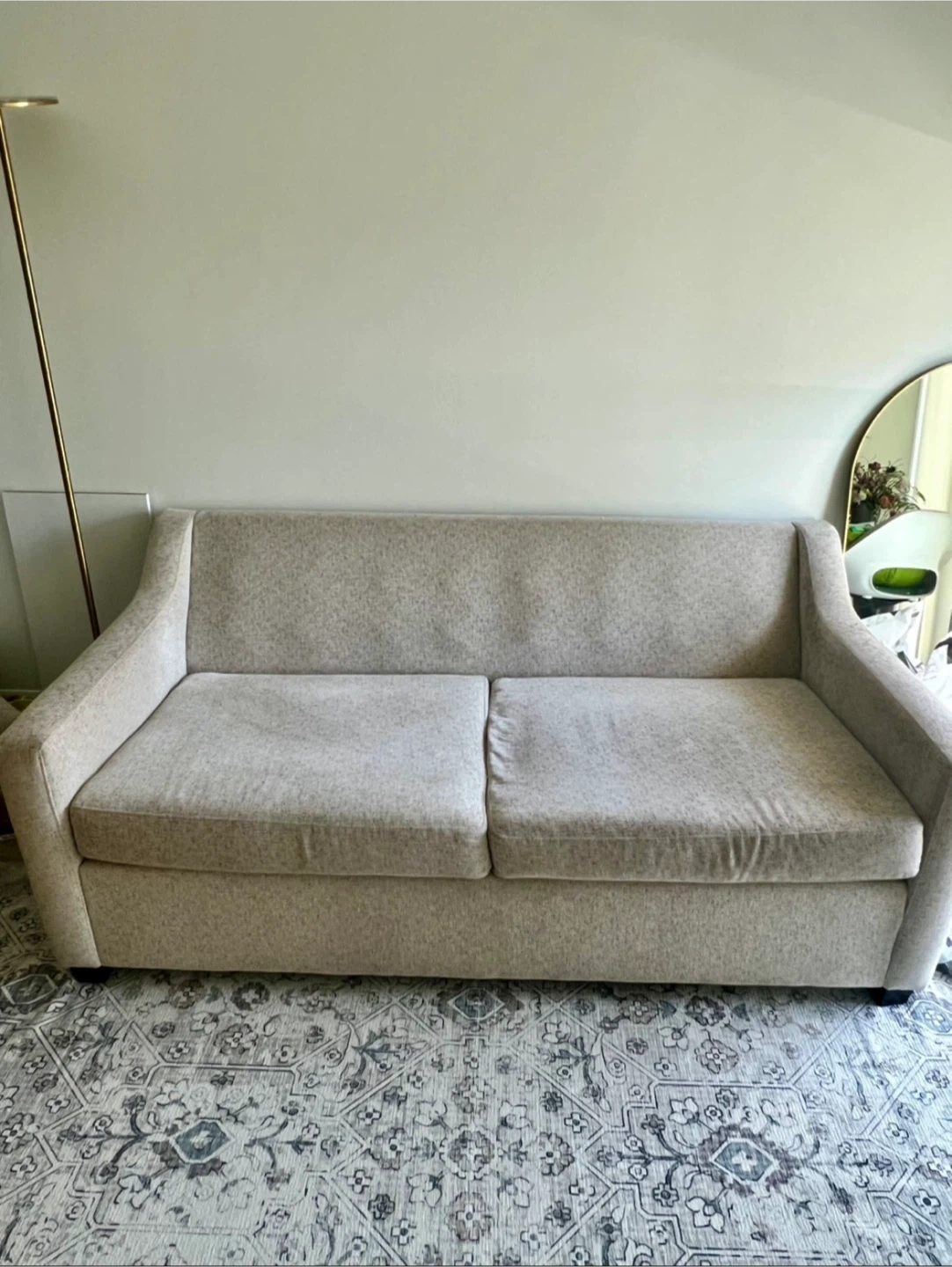 Lovely Chesterfield Mattress Sofa bed. Cushion seat fabrics are washable. Double Bamboo mattress. Yellow pillow NOT INCLUDED. The couch is extremely comfortable, fits three people comfortably, can fit a fourth person too with little squeeze. Colour is like an Ecru white with speckle design. Couch is in good condition, still firm but soft, your body will be glad sitting or laying on this. It feels like heaven. Need to sell as it doesn’t fit in my current apartment but it’s worth the price. Original price $2000 excl. tax but I’m selling it for less than quarter of the original, for $400. If you’re interested please DM me. Please and thank you.