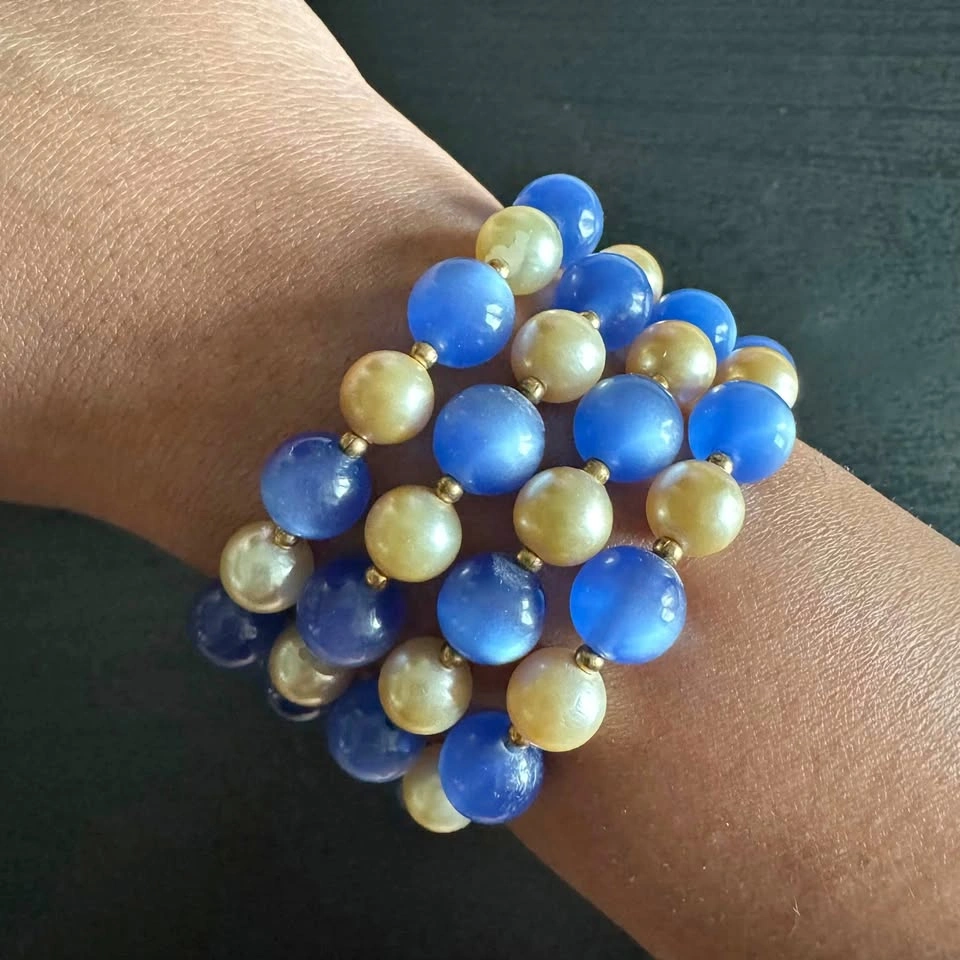 262Beautiful wrap bracelet in good vintage condition. Some peeling noted on some of the ivory white bead which is not very noticeable—quite an eye-catching piece! Selling as is. Let me know if you have any questions or require more photos/videos. Photos/video were taken in late evening light and some in indoor warm light.